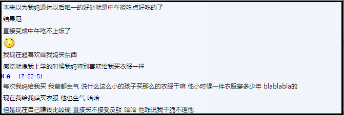 这位小伙伴得知我在为挑选母情节礼物而苦恼,私底下给我提供了很多参考,聊天中得知这位大男孩对自己妈妈的宠爱毫无保留,比如他妈妈退休前最后一天上班,他买了好大一束康乃馨和爸爸一起去接妈妈下班,对妈妈的承诺都言出必行。