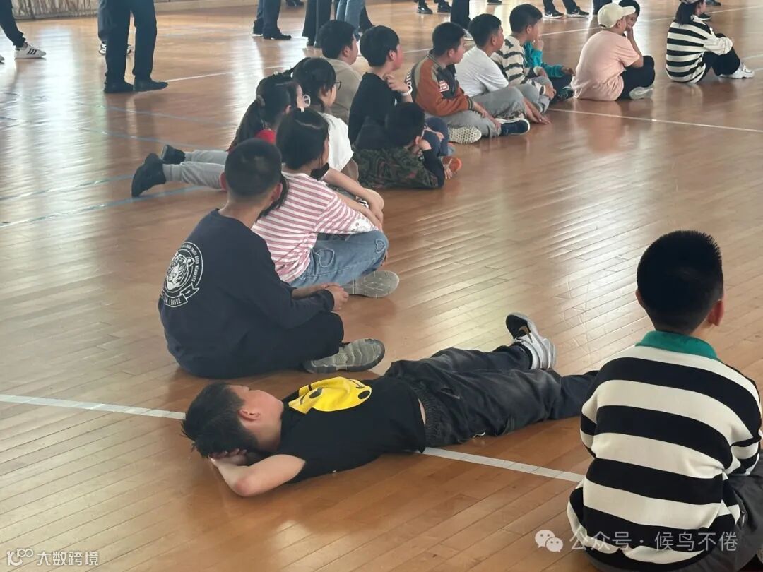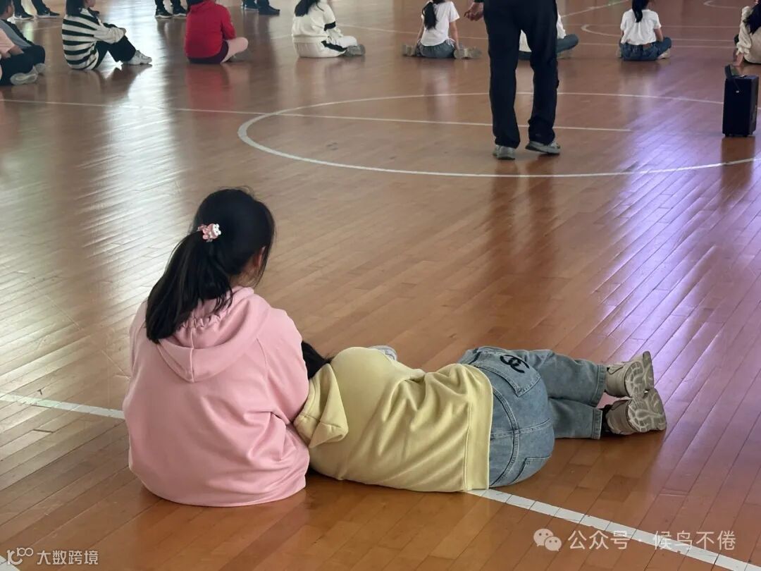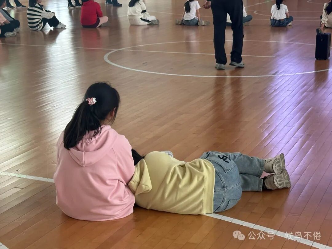 孩子们围成一个大圆圈,席地而坐。孟老师播放视频。虽然有60多人观摩,孩子们却相当放松,有的顺势倒在小伙伴的腿上,有的趴在地板上,有的干脆躺下来,仰面朝天。