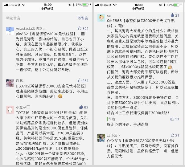 如众多留言所述,两条线路各有千秋,包裹内件少的选补贴线,件数多的,想买luna、香水饰品的选Z3000无忧线。线路均享税费补贴,都是不可替代,所以尊重你们的想法,继续保留两条线路同时运行的模式,再次感谢你们的参与,也恭喜以下几位获奖的小伙伴,对应的奖项已全部发放完毕啰,请查收。