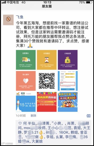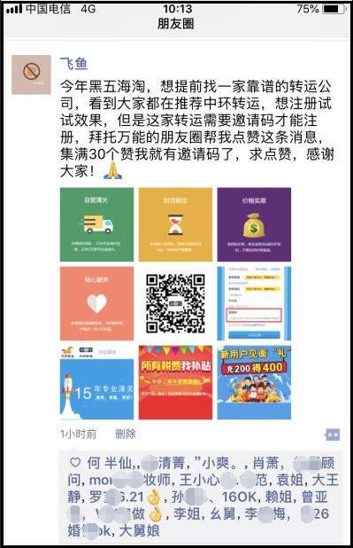 1、文字:今年黑五海淘,想提前找一家靠谱的转运公司,看到大家都在推荐中环转运,想注册试试效果,但是这家转运需要邀请码才能注册,拜托万能的朋友圈帮我点赞这条消息,集满30个赞我就有邀请码了,求点赞,感谢大家!