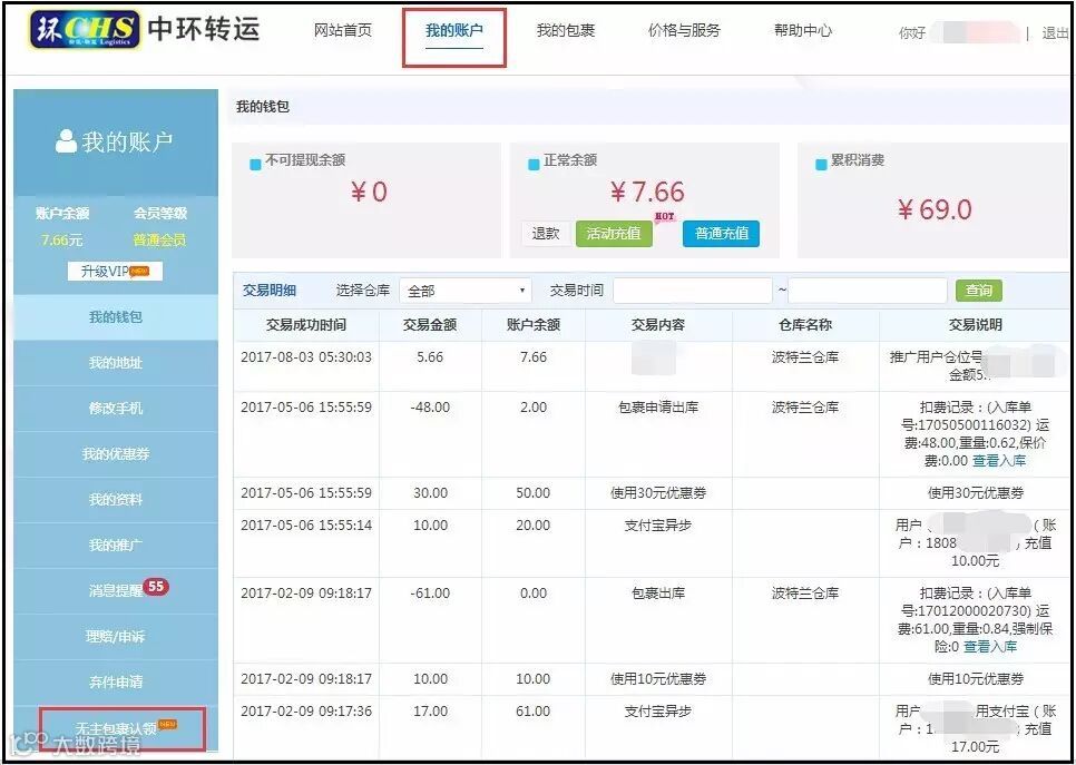 一、首先登陆中环转运官网,进入“我的账户”点击“无主包裹认领”项。