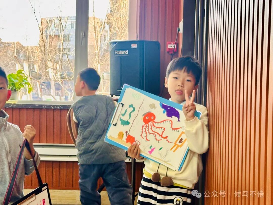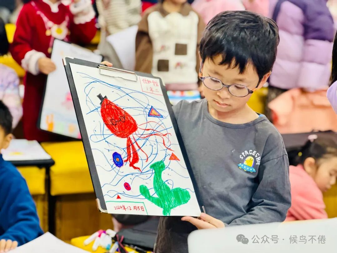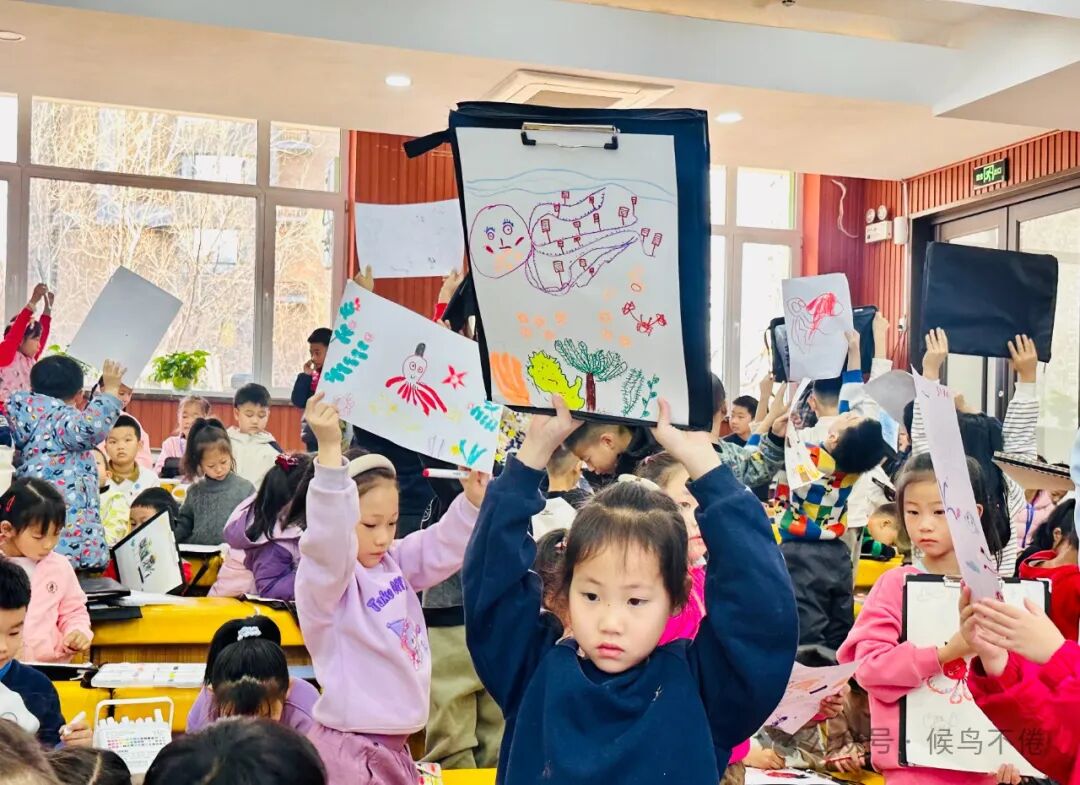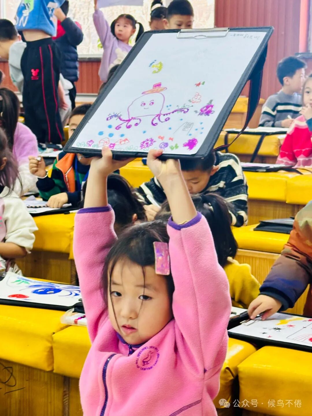 对于美术,我是小白。镜头里孩子们的画板,我只能看个热闹,看不出门道。但是眼前活生生的孩子,专注的,旁若无人,兴奋的,交头接耳,动作快的,一个个高高举起自己的作品。一定是做对了什么。孩子对了,教育就对了。给我留下最深印象的,是一个男生,他大概忘记带彩笔,但没有哭鼻子,随机应变用铅笔。虽然他的作品色彩单一,但是他却同样骄傲地举起他的画,对着我的镜头,示意我给他拍照,见我拍了,他立即又说:“老师,我还有一张!”原来背面也画了一幅。我相信,他的心里,一定是洒满了七彩阳光。