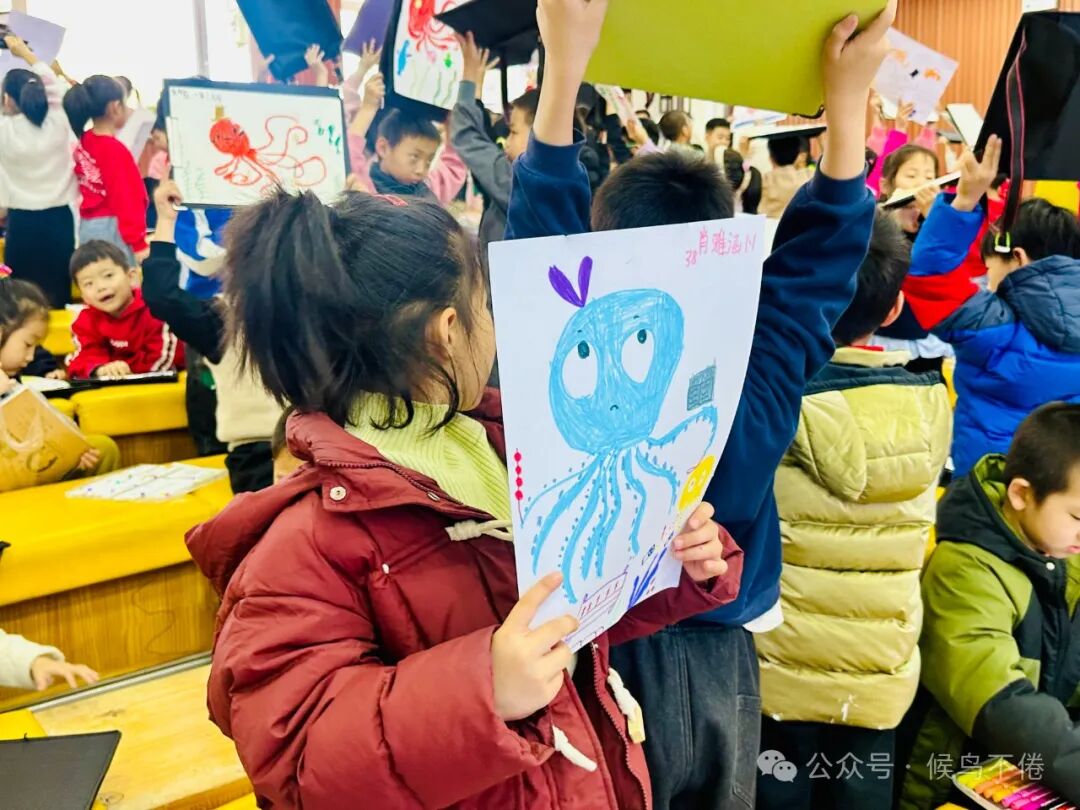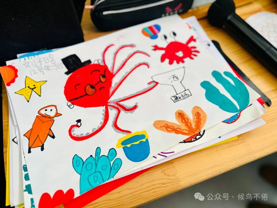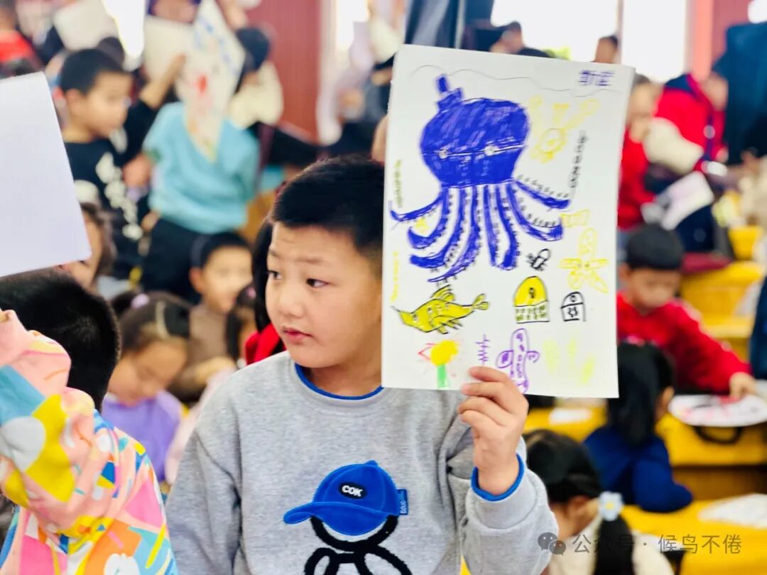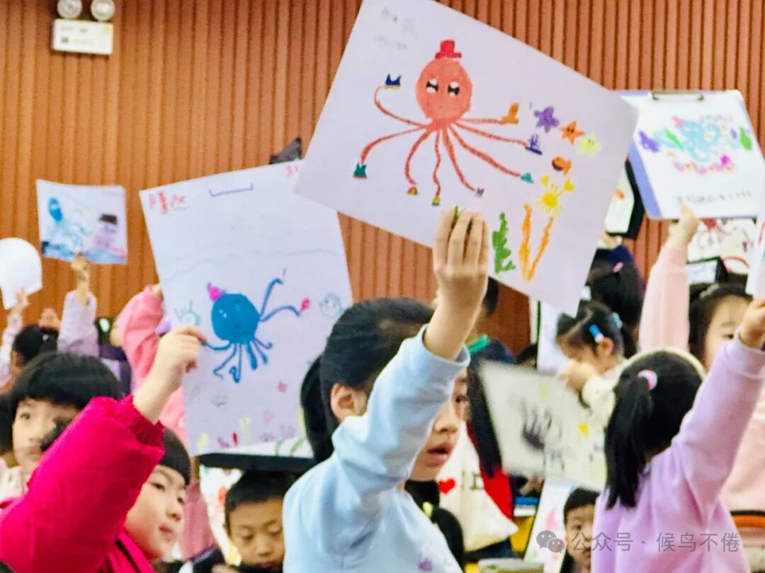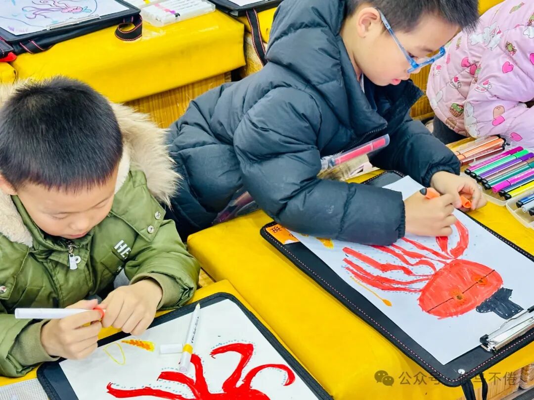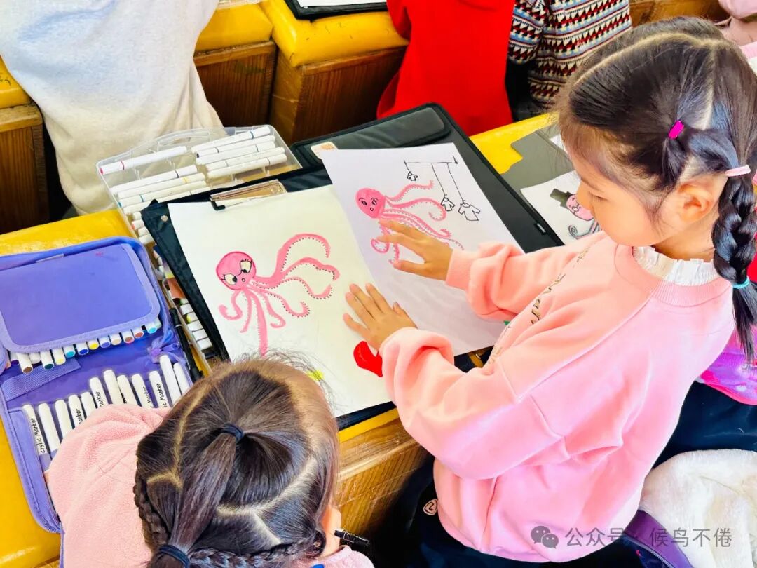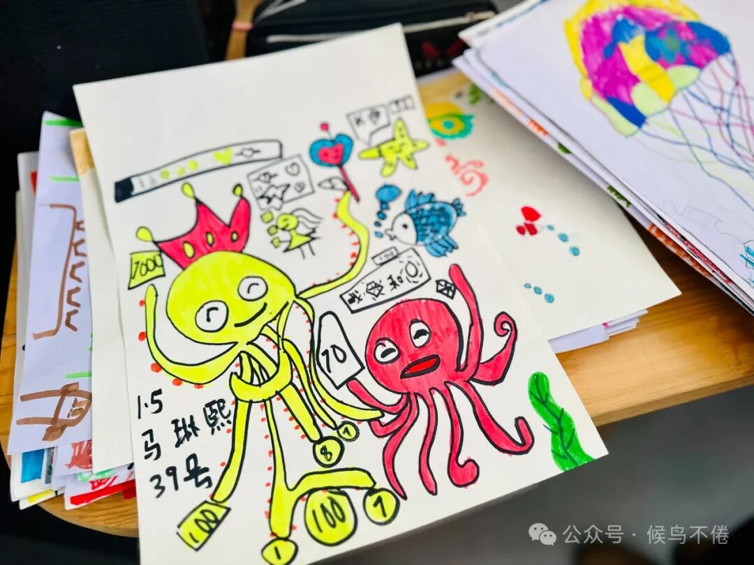 看孩子们的进度,这节课已经接近尾声。我一边忙着拍照,一边跟班主任老师聊了几句,“我们是一年级,六个班。美术大课每两周上一次。每次都有不同的主题,今天的主题是海洋,章鱼小卖部。一会儿李老师会用灵动币收购孩子们的作品.....”