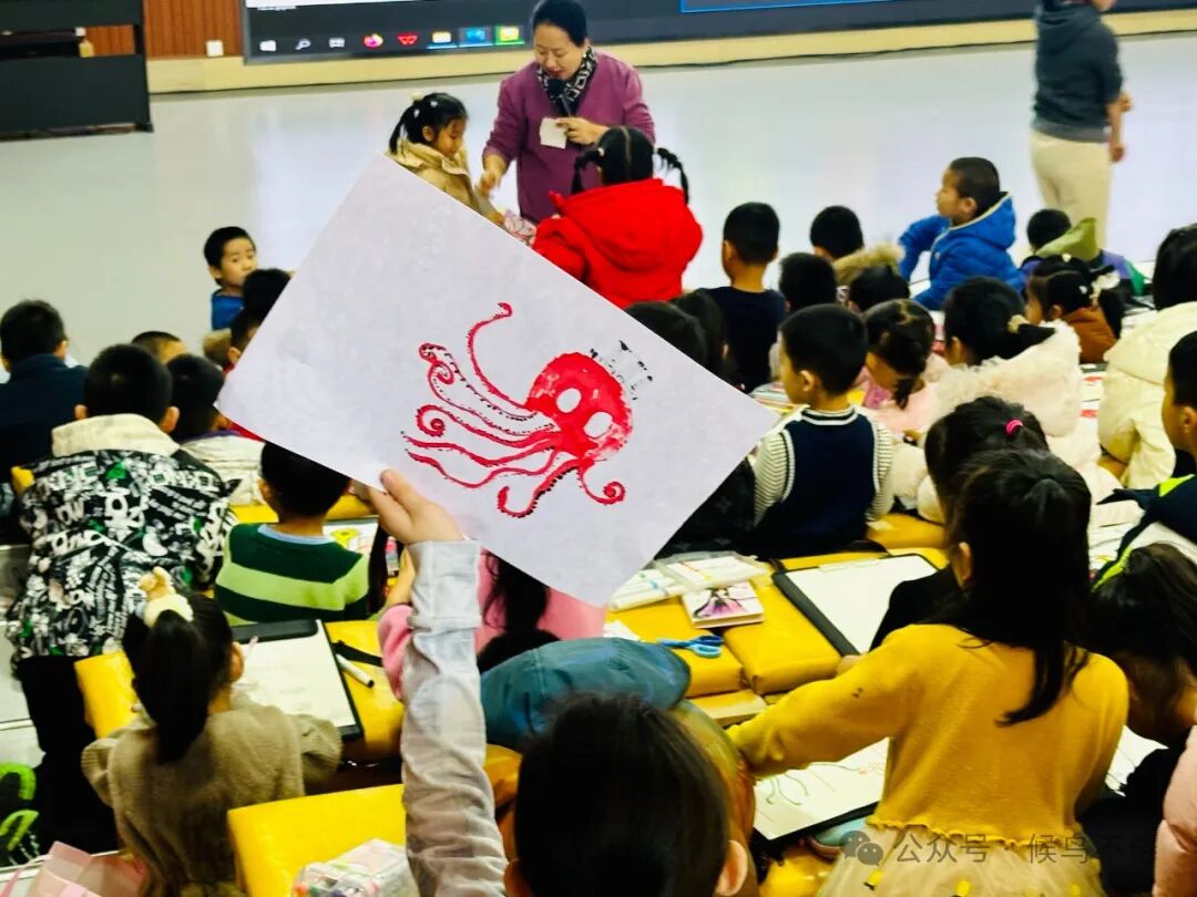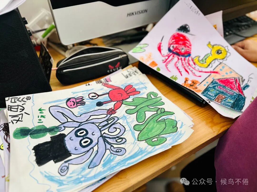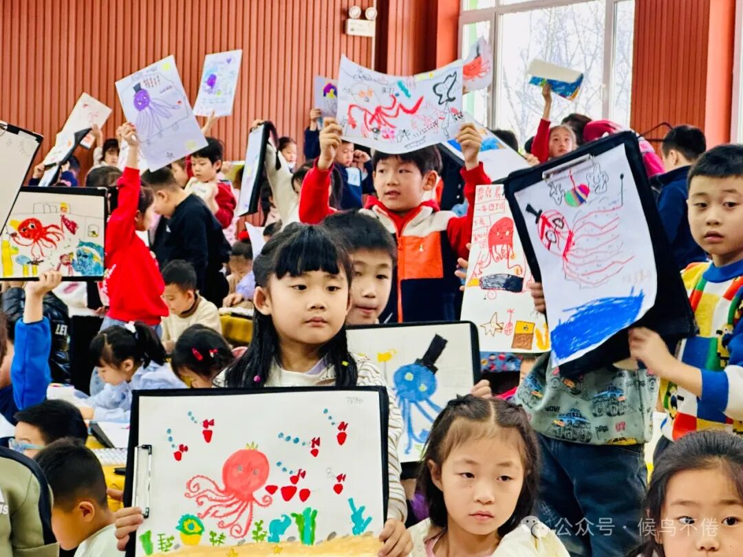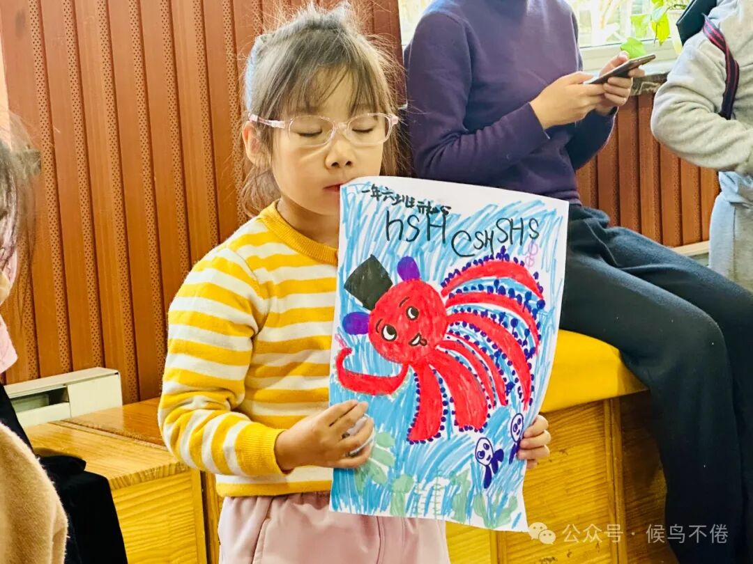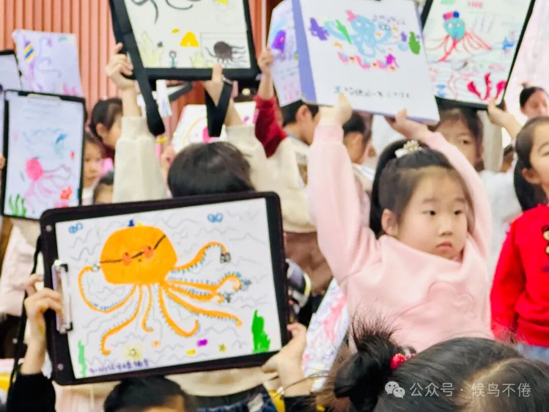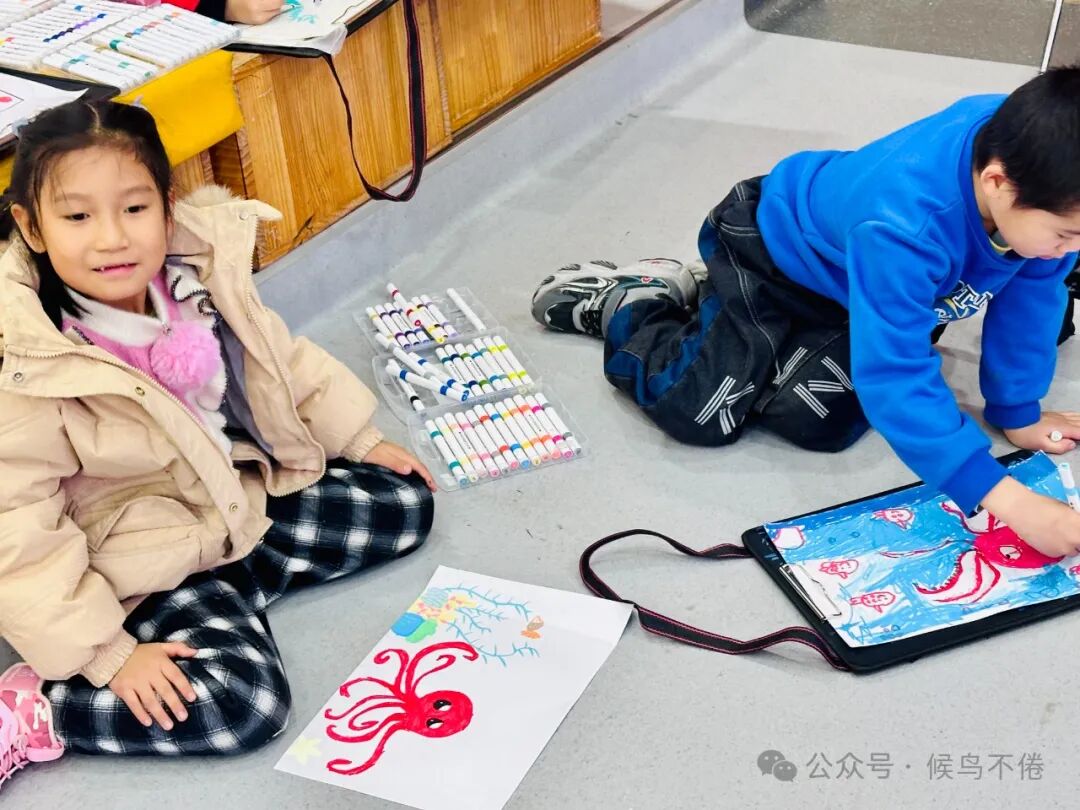 看孩子们的进度,这节课已经接近尾声。我一边忙着拍照,一边跟班主任老师聊了几句,“我们是一年级,六个班。美术大课每两周上一次。每次都有不同的主题,今天的主题是海洋,章鱼小卖部。一会儿李老师会用灵动币收购孩子们的作品.....”