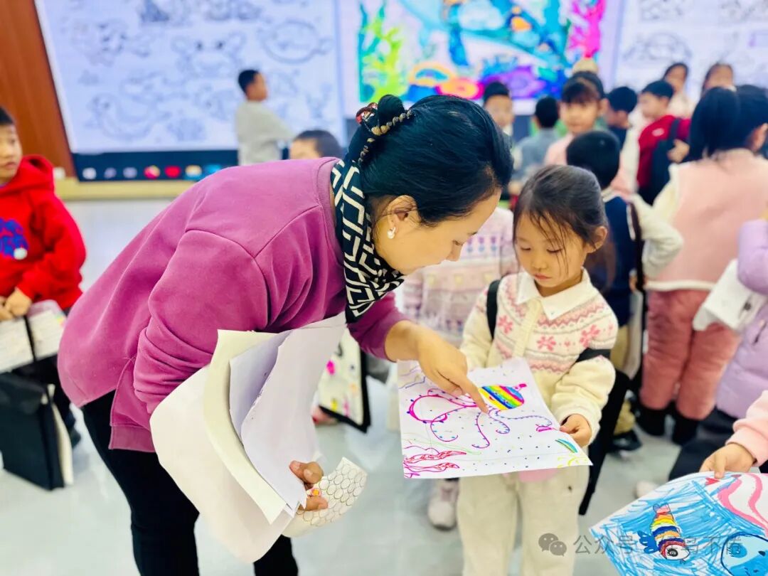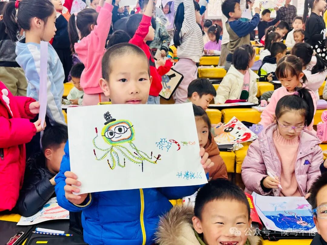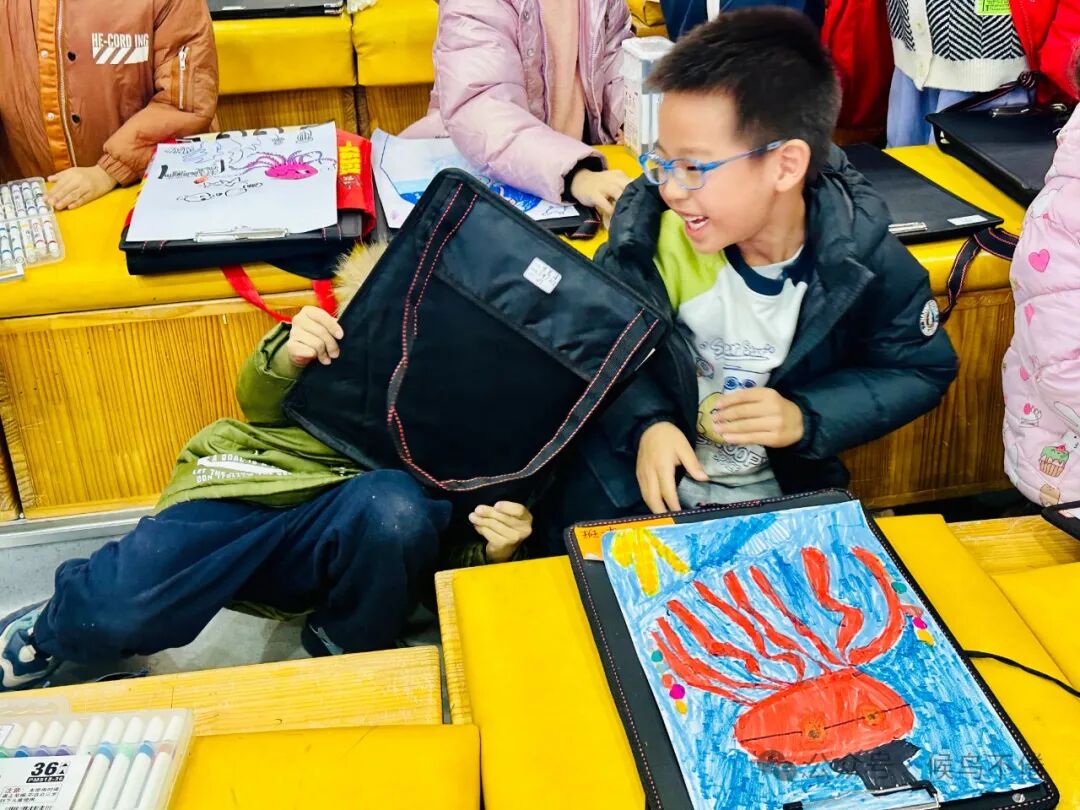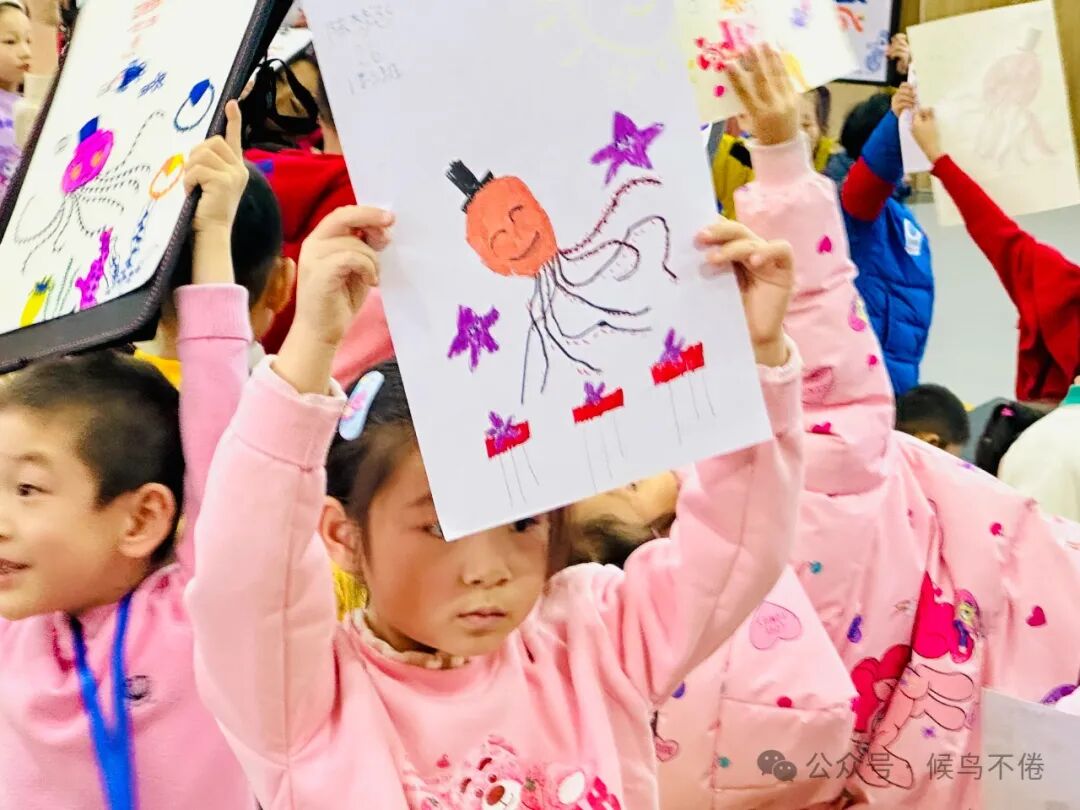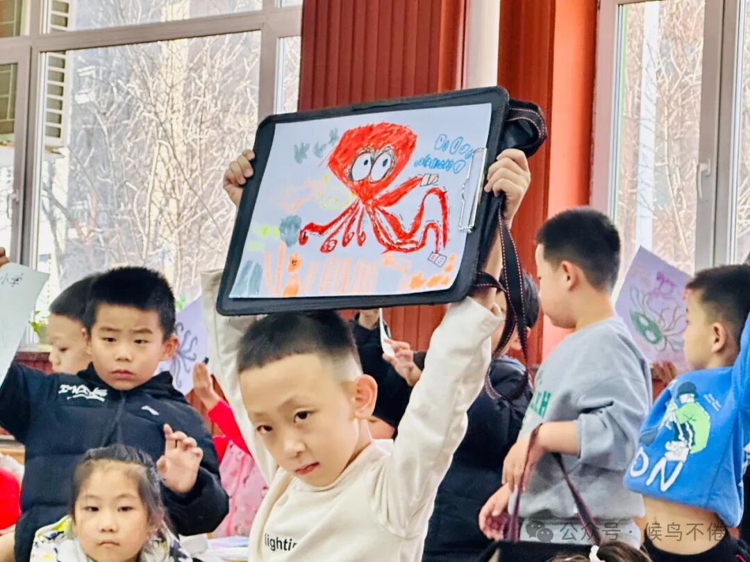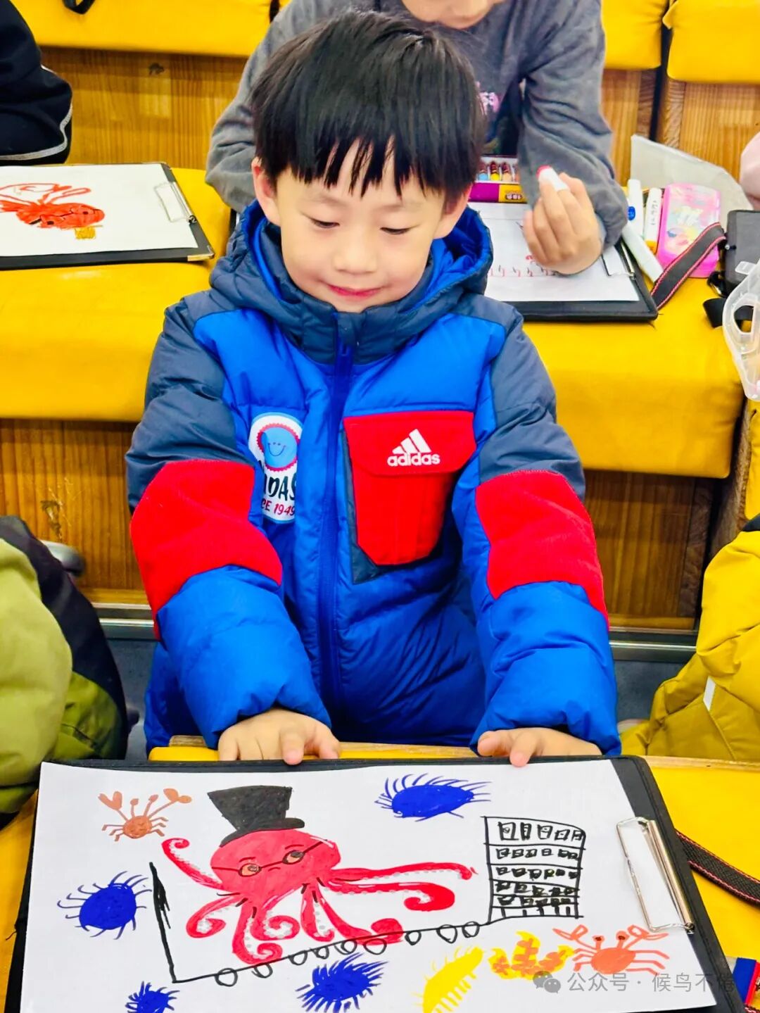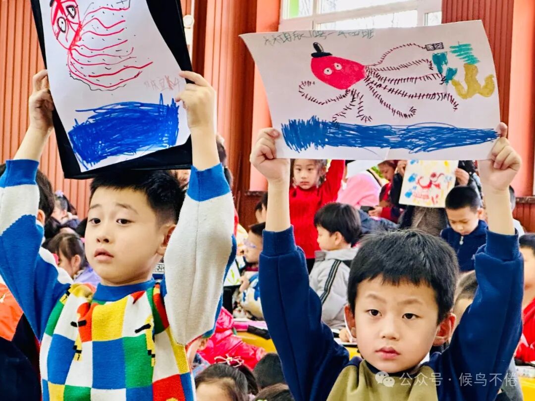 看孩子们的进度,这节课已经接近尾声。我一边忙着拍照,一边跟班主任老师聊了几句,“我们是一年级,六个班。美术大课每两周上一次。每次都有不同的主题,今天的主题是海洋,章鱼小卖部。一会儿李老师会用灵动币收购孩子们的作品.....”