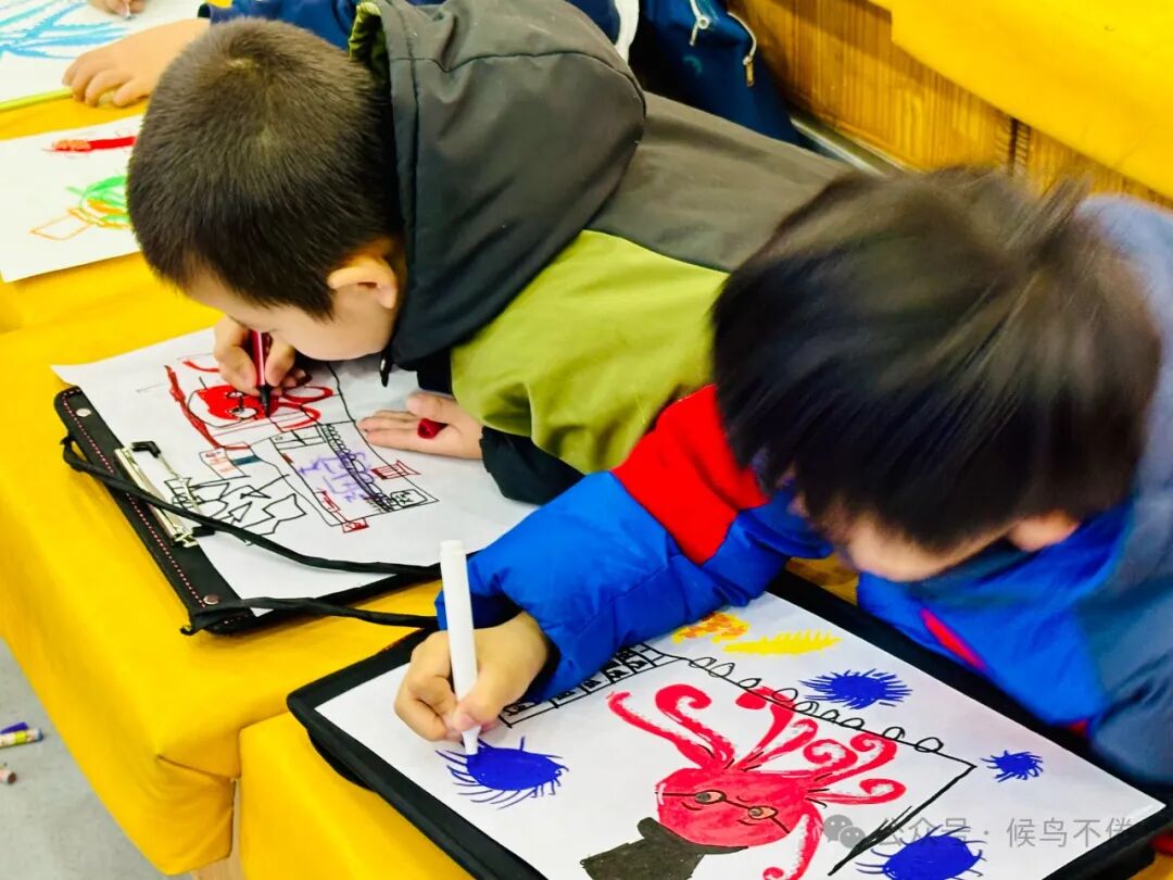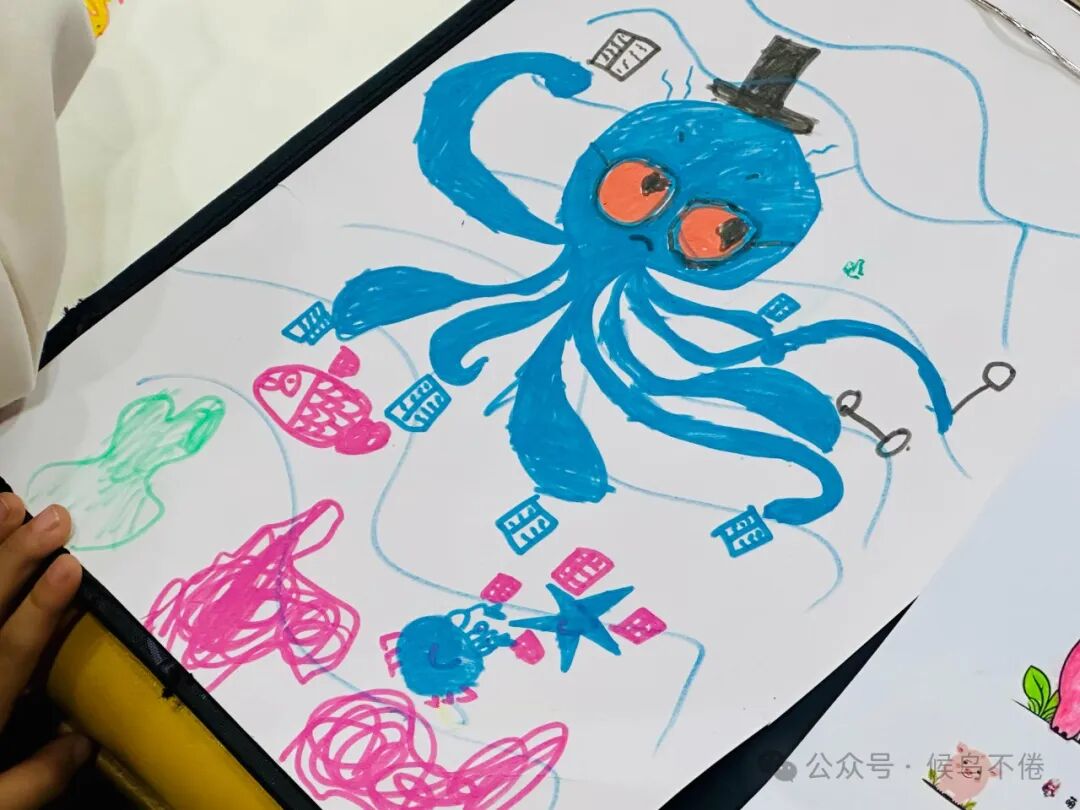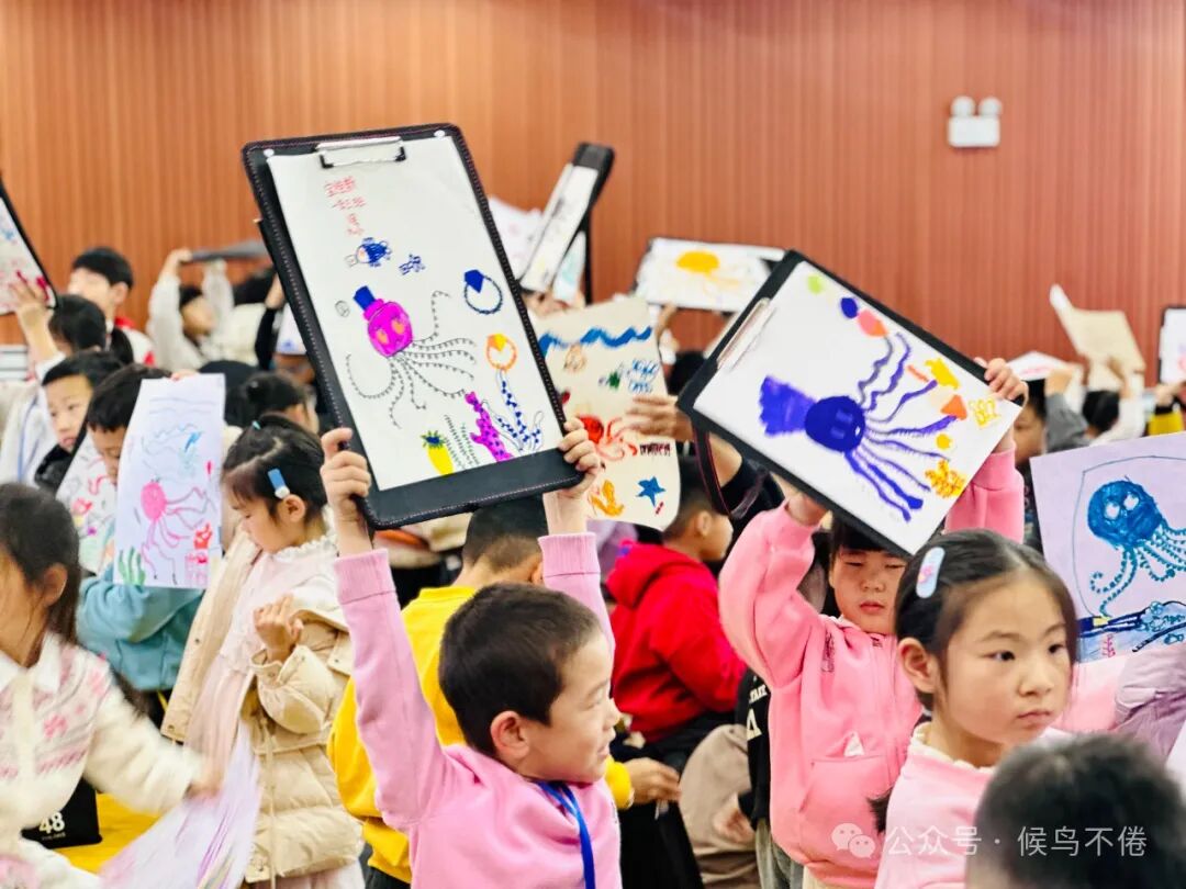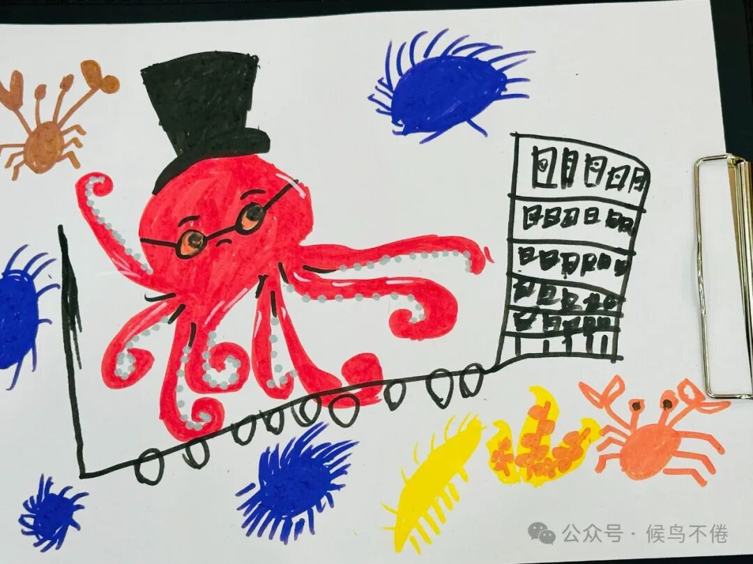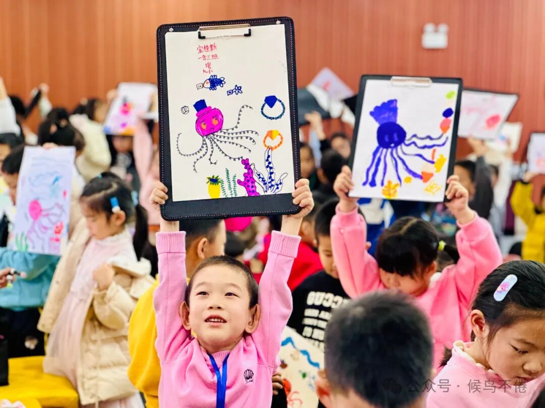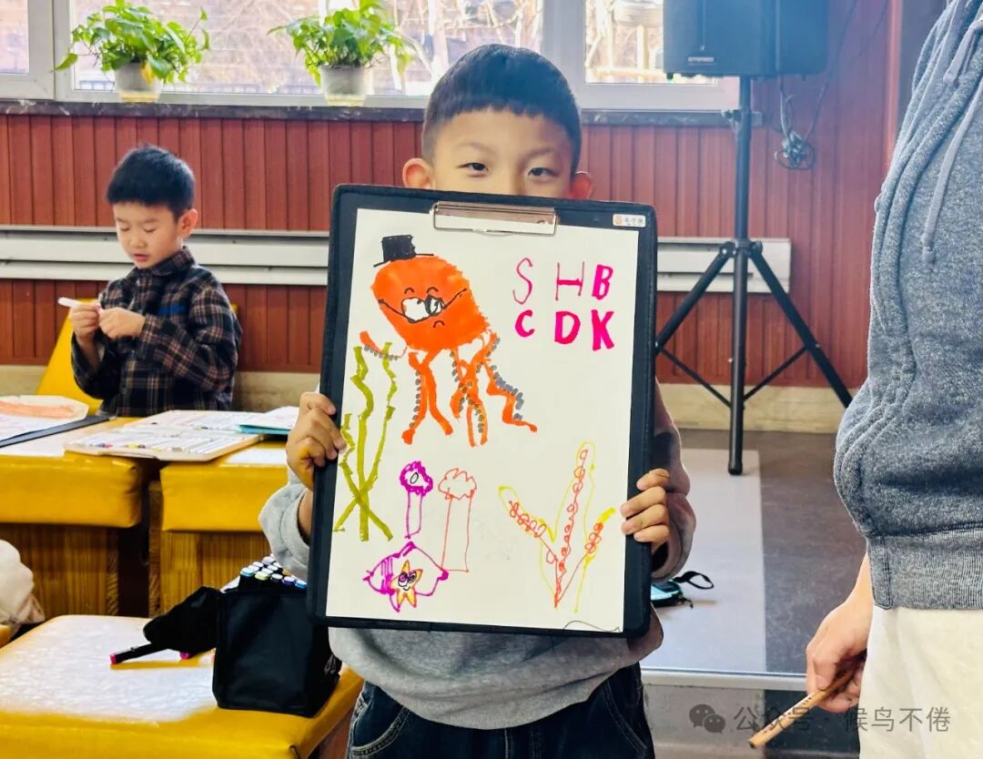看孩子们的进度,这节课已经接近尾声。我一边忙着拍照,一边跟班主任老师聊了几句,“我们是一年级,六个班。美术大课每两周上一次。每次都有不同的主题,今天的主题是海洋,章鱼小卖部。一会儿李老师会用灵动币收购孩子们的作品.....”