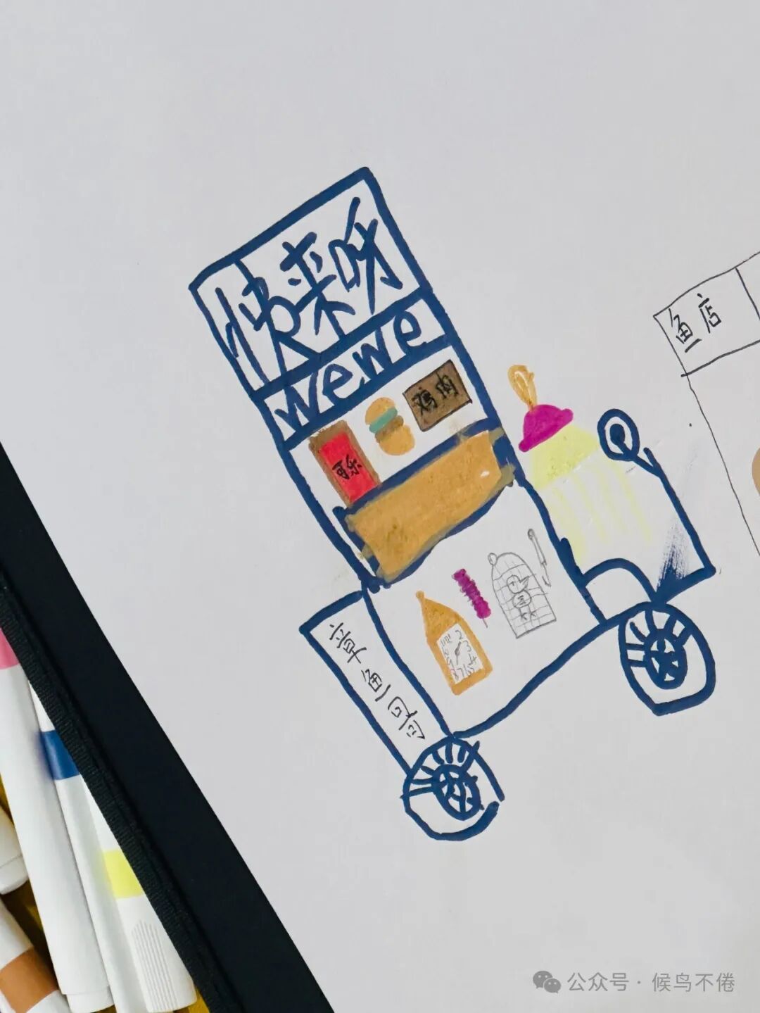 上课之前,我会告诉孩子们作画的全部流程:欣赏绘本故事,头脑风暴,讨论商业计划,起稿上色,添加背景,签上自己的名字,同时注明班级。孩子们知道这一节课需要做什么,以及先后顺序。
