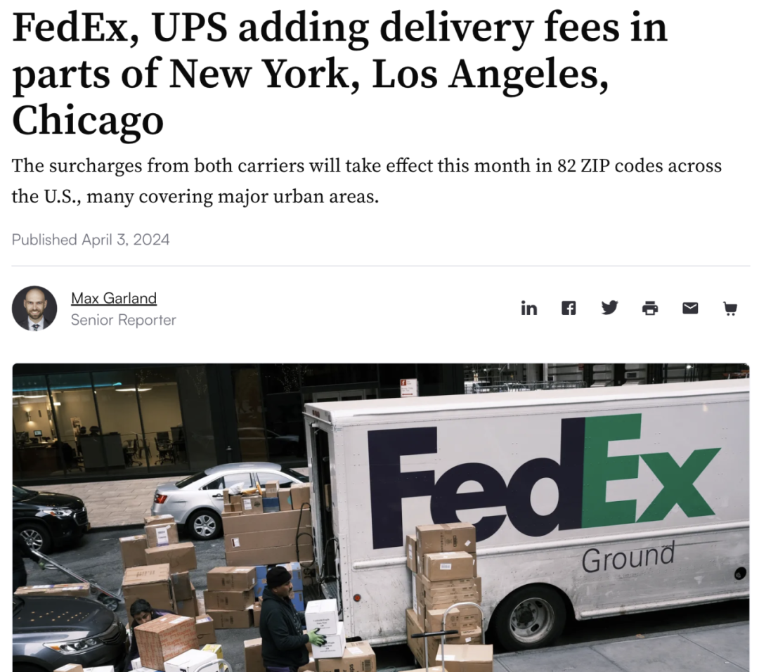 UPS和FedEx这两家运输公司的附加费将在本月开始生效,影响美国境内82个邮政编码区域,其中许多覆盖了主要的城市区域。