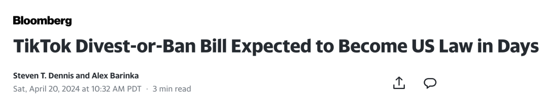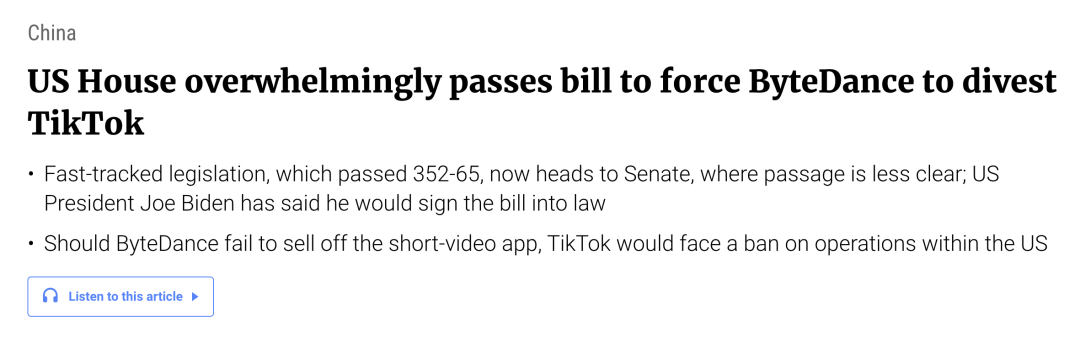 最近的一项立法行动中,美国众议院通过了一项法案,要求字节跳动公司必须剥离其在美国的短视频应用TikTok,否则该平台将面临在美国市场的全面禁止。这项法案已经得到了两党的广泛支持,拜登总统已经将其签署成为法律。