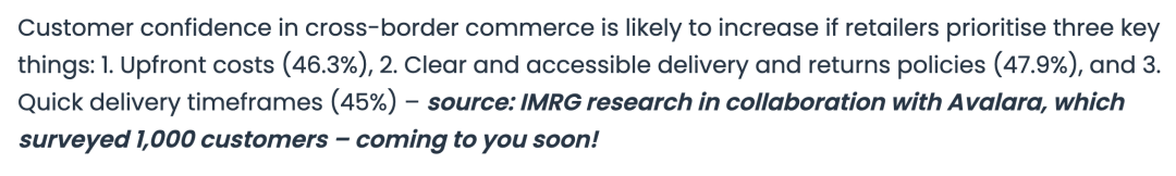随着假日季订单的增加,客户服务和售后管理的需求也大幅提升。特别是在跨境电商中,退货流程的便捷性和清晰的客户服务沟通对提升用户满意度至关重要。在调研中,一名物流从业人员表示,在2024年的前四个月,发货量同比增长了2%,而退货量则增长了11%。这些数据表明,如果消费者有良好的购物体验,他们对从海外购买商品的信心正逐步增加。根据数据,如果零售商优先考虑以下三个关键因素,消费者对跨境电商的信心可能会增加:1. 透明的前期成本(46.3%),2. 清晰且易于获取的配送和退货政策(47.9%),3. 快速的配送时间(45%)。