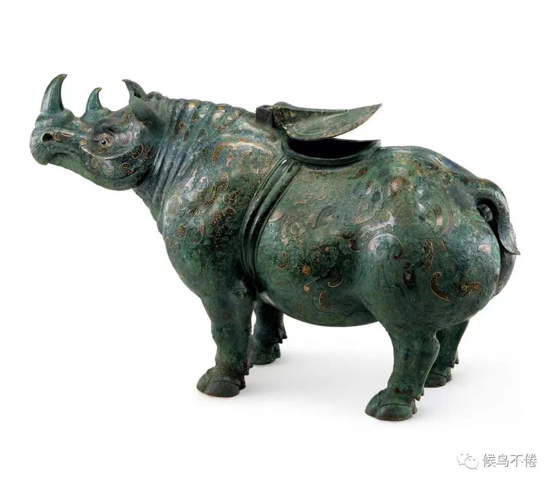 中国古代做成动物形的酒尊不乏其例,如商时期铜器中的牛尊、象尊、豕尊等,周代铜器中的驹尊、兔尊、鸭尊等。到了汉代,肖形尊虽已不太流行,但仍为人们所钟爱。这件铜尊采用犀牛的造型,犀牛昂首伫立,肌肉发达,比例准确,体态雄健,为古代生息在中国的苏门犀的形象。