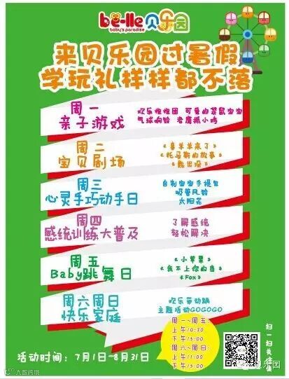 贝贝为了让麻麻们更好的了解每日活动,再次将贝乐园的活动安排发送一次哦!您还可以分享到朋友圈约上宝宝的好朋友一起来参加哟!