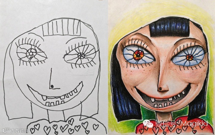 「这张图就是整件事情的开端。当时,我只是纯粹想帮我四岁女儿的画上个色来看看会是什么样。所以我就用彩色铅笔开始上色。不过我画完之后才想到,应该要在上色前先拍张照来做对比。」