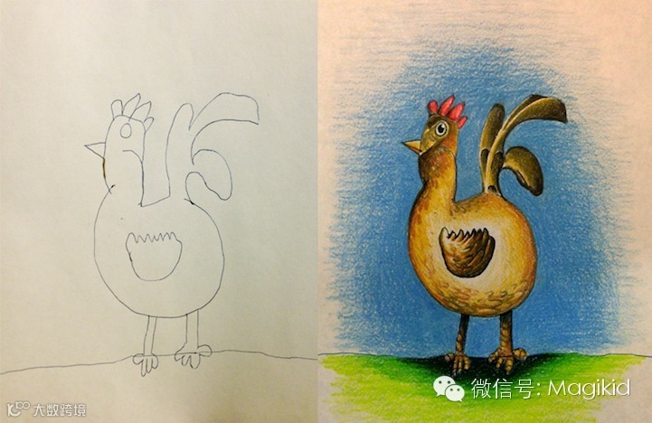 「这张则是我儿子画的阿罗卡纳鸡。上面这两张都是在家里画成的。」