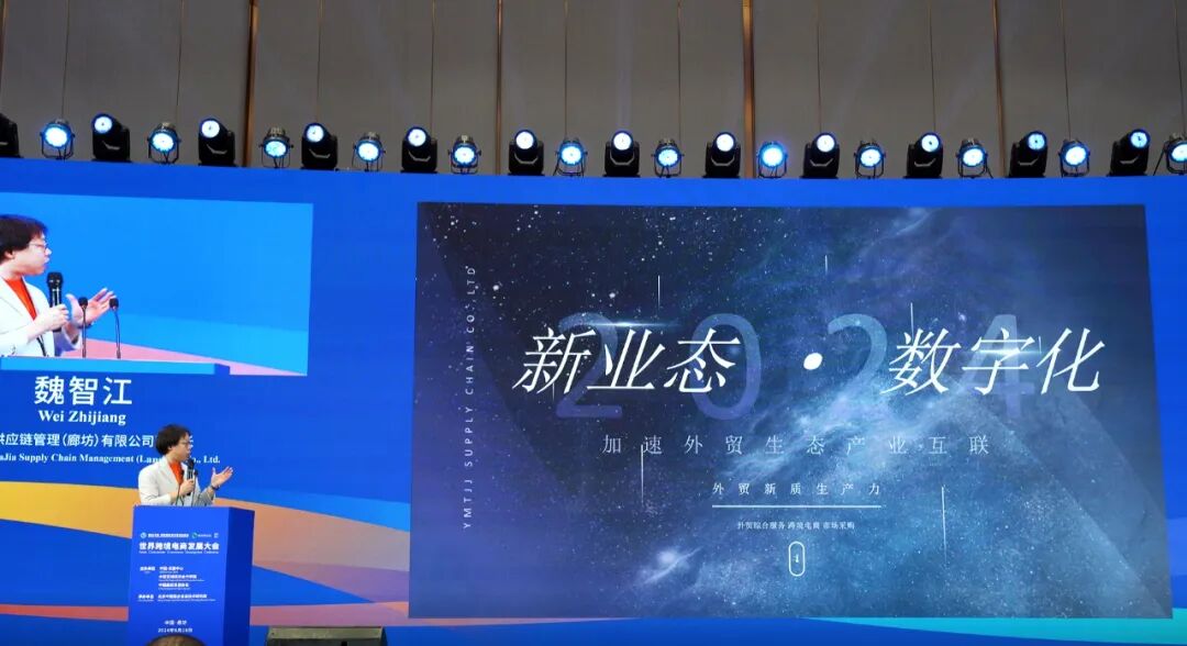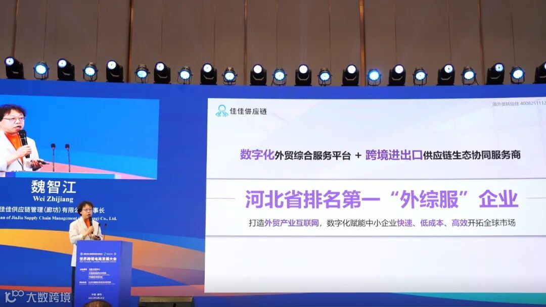 6月16日下午,在世界跨境电商发展大会上,中国服务贸易协会会长张伟主持了本场会议。佳佳供应链管理(廊坊)有限公司董事长魏智江发表了题为《新业态·数字化 加速外贸生态产业互联》的现场演讲。