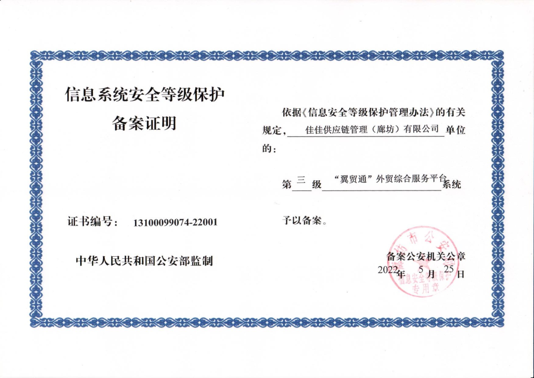 数字时代,数据的安全对于企业来说显得尤为重要,佳佳供应链更是一直致力于为客户的数据安全搭建更健全的机制。在“翼贸通”SaaS平台研发过程中,佳佳供应链一方面严格遵循信息系统安全等级保护标准,完善自身管理体系;另一方面夯实产品从规划设计、开发测试到上线运营的全生命周期的规范化技术能力,打造了一个链接物流服务商、报关行、海外仓展、银行、政府、金融机构等多方参与的智能开放创新平台,为中小企业提供专业、低成本的外贸全流程一站式服务。