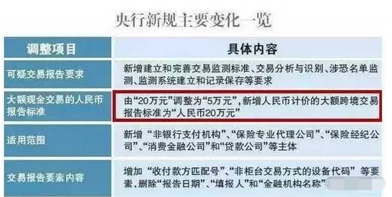 《管理办法》核心内容就是将大额现金交易的人民币报告标准由20万元调整为5万元,对跨境资金交易,金融机构应当报送大额交易报告。