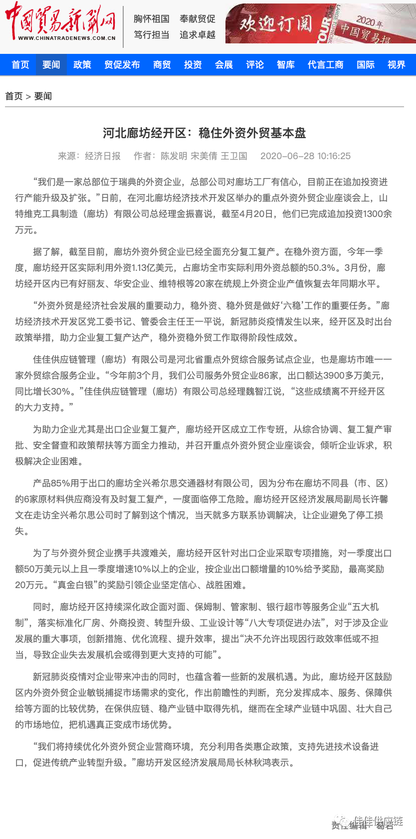 佳佳供应链管理(廊坊)有限公司是河北省重点外贸综合服务试点企业,也是廊坊市唯一一家外贸综合服务企业。“今年前3个月,我们公司服务外贸企业86家,出口额达3900多万美元,同比增长30%。”佳佳供应链管理(廊坊)有限公司总经理魏智江说,“这些成绩离不开经开区的大力支持。”