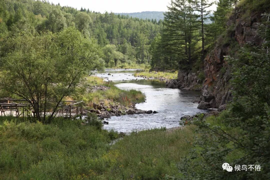 三潭峡是阿尔山之行的最后一景。景区入口处介绍这样写道:“三潭峡位于哈拉哈河的上游,河水在石塘林地下潜流 10 多公里后流出地面,形成了一段别具特色的峡谷,峡谷右岸为玄武岩熔岩台地,左岸是陡峭的山峰,杜鹃花漫山遍野,火山熔岩布满河谷。这里的河床坡度大,湍急的哈拉哈河从河谷穿过,珠飞玉溅,长约 3公里的峡谷中依次分布着卧牛潭、虎石潭和悦心潭。诗曰:神奇灵秀三潭峡,清泉汩汩绕山崖,喷珠溅玉何处去,魂系遥遥东海家。”
