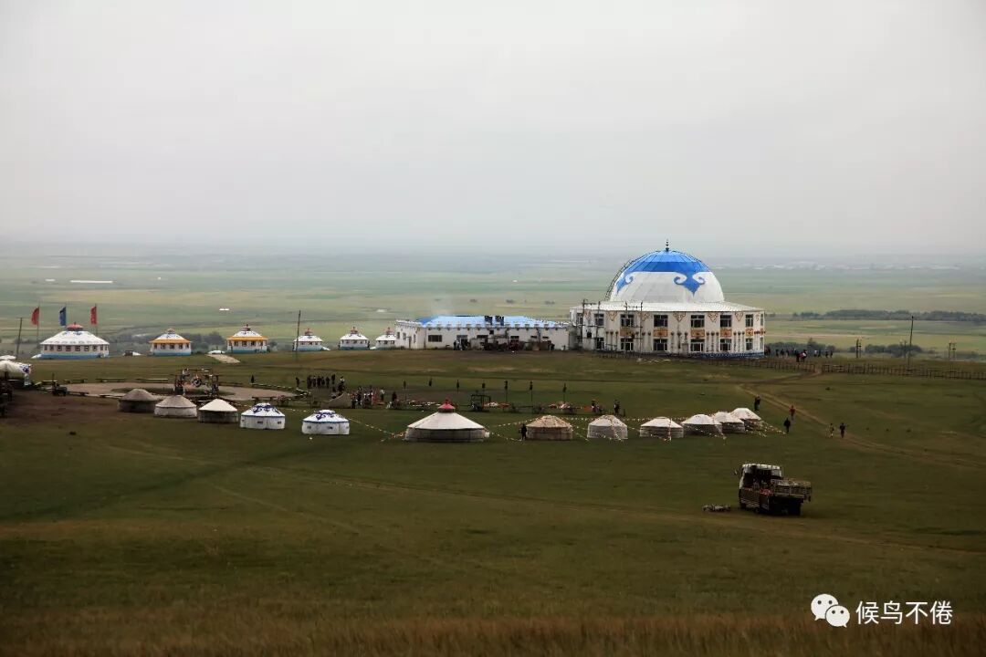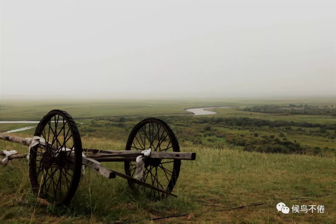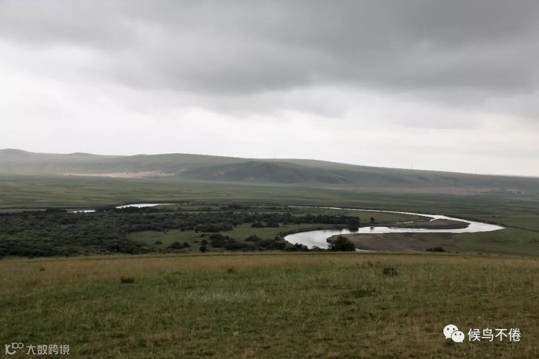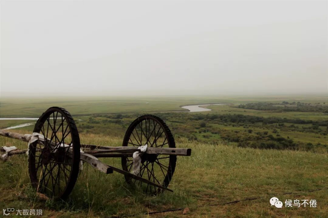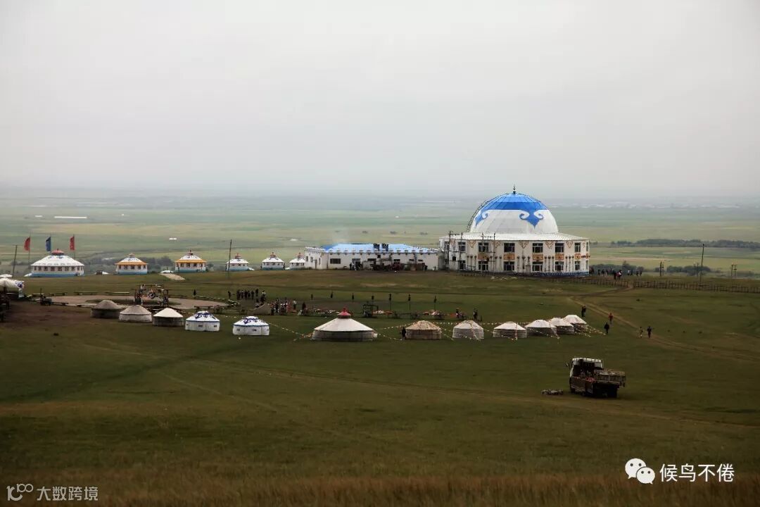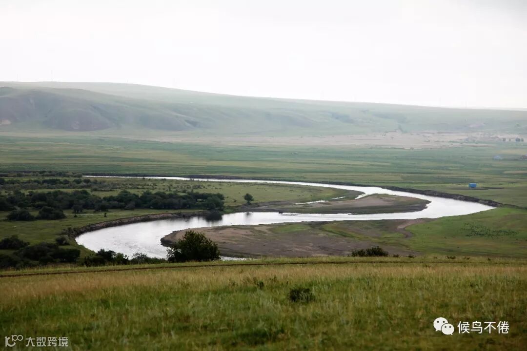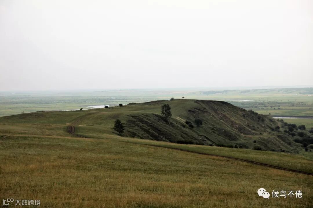 恨不能后脑勺也长了眼睛。没有太阳,我分不清方向,只能以敖包为界,正前方,左侧,大草原一望无际。到了这里,才真正懂得什么是一望无际。大概因为下雨,不见马群、牛群和羊群;右侧,远远地,起伏的山丘,被乌云染成了铅灰色,山丘和乌云几乎要亲吻在一起,再近一些,蜿蜒的伊敏河静静地穿过大草原,在我的镜头里泛着耀眼的银光,成为整个暗淡画面中唯一的亮色,衬得草原像涂了墨,这便是所谓的墨绿吧;身后,那个巨大的蒙古包(景区饭店)周围散落着数十个小的蒙古包,确切地说,是蒙古包形状的现代化旅店,可惜没有机会在这里过夜。