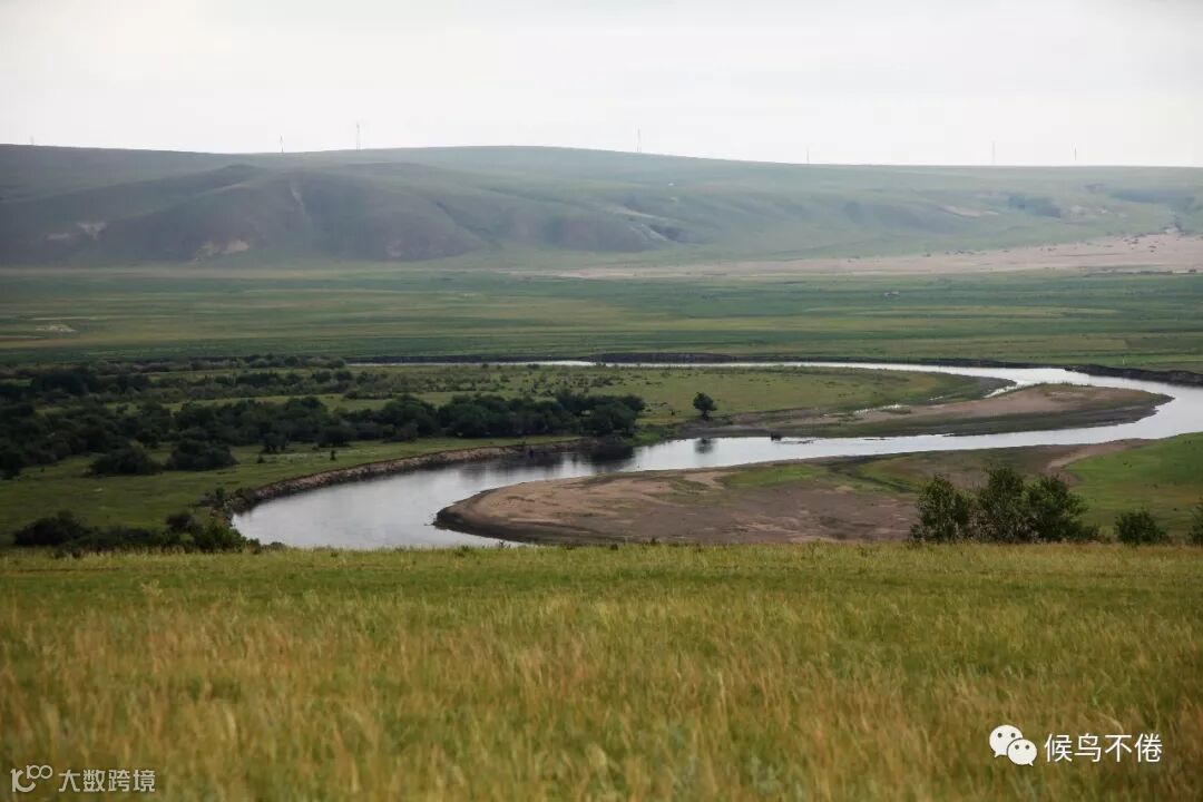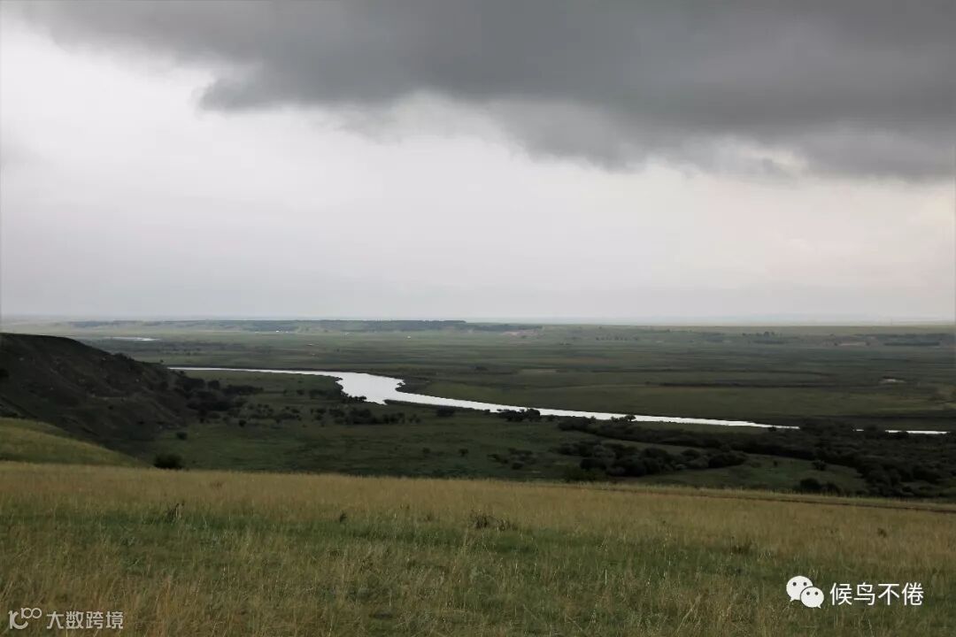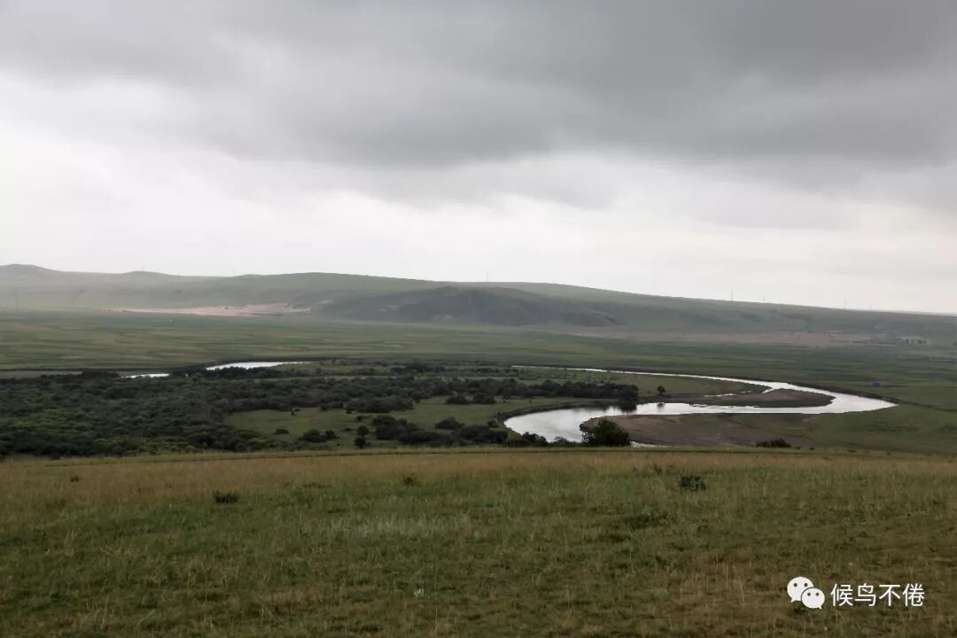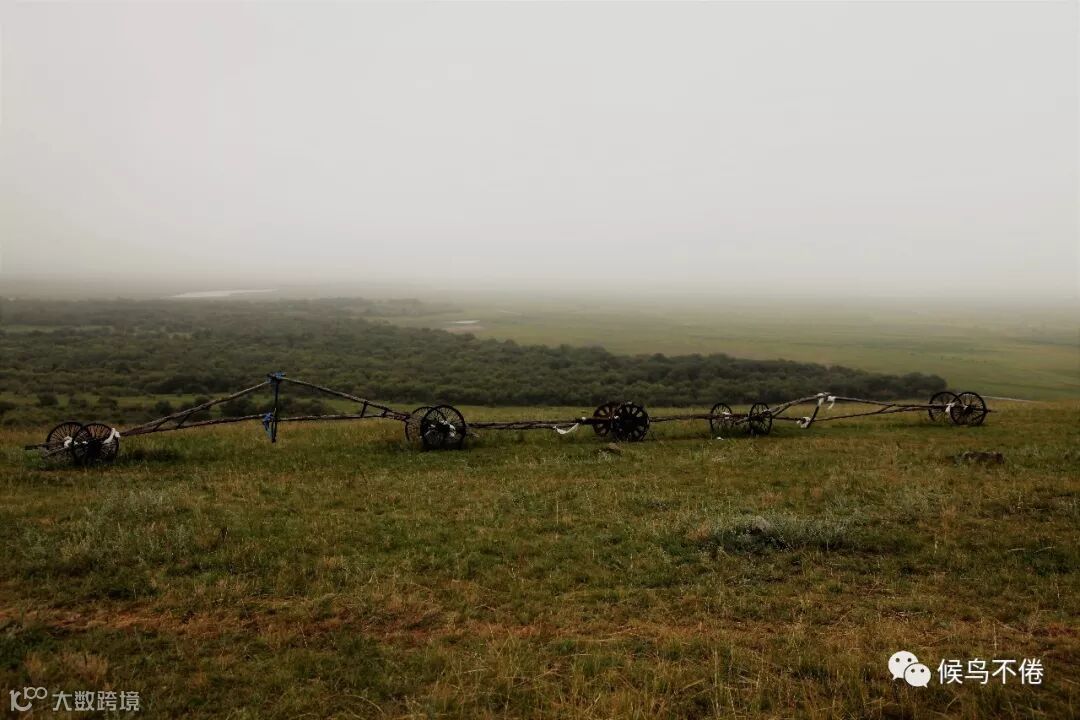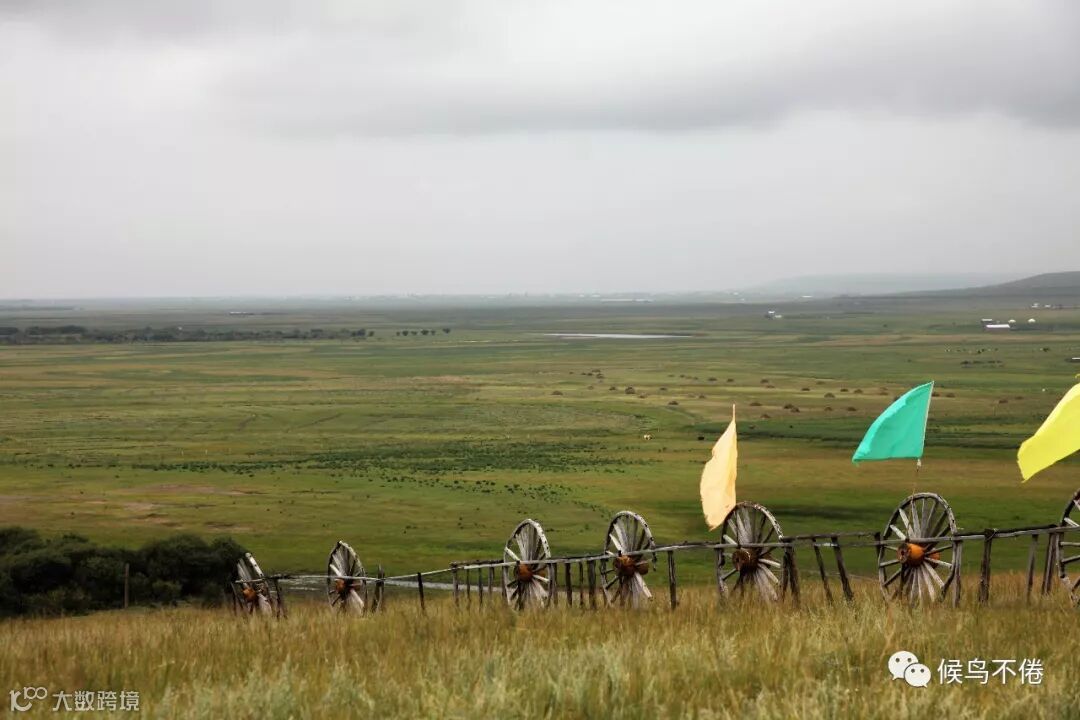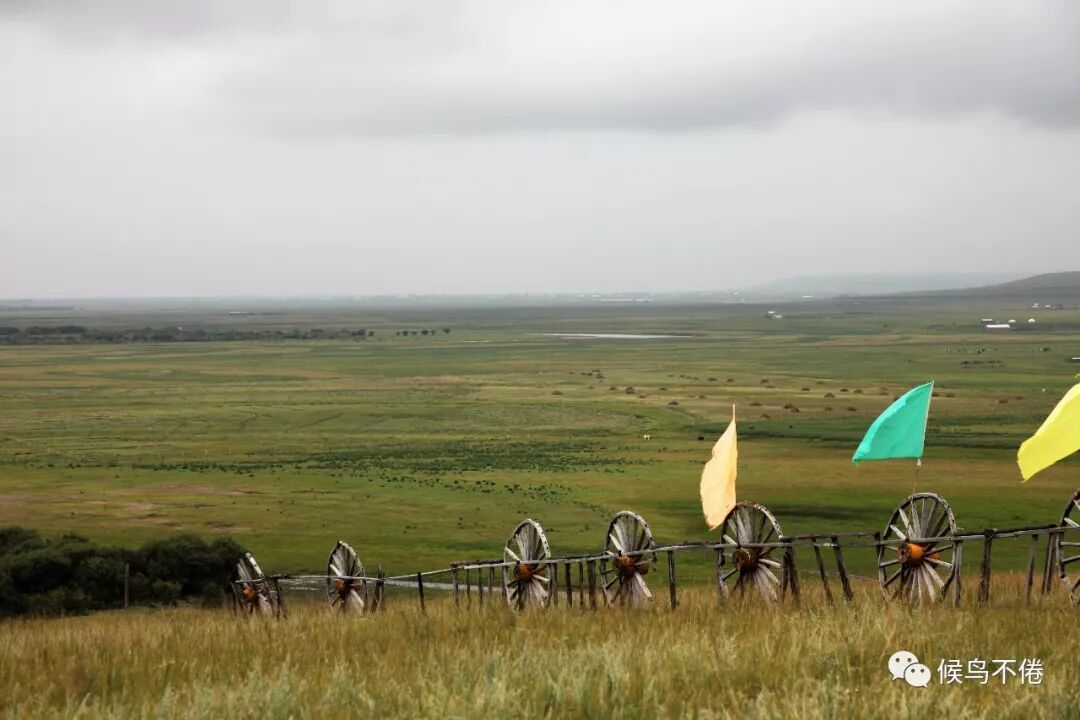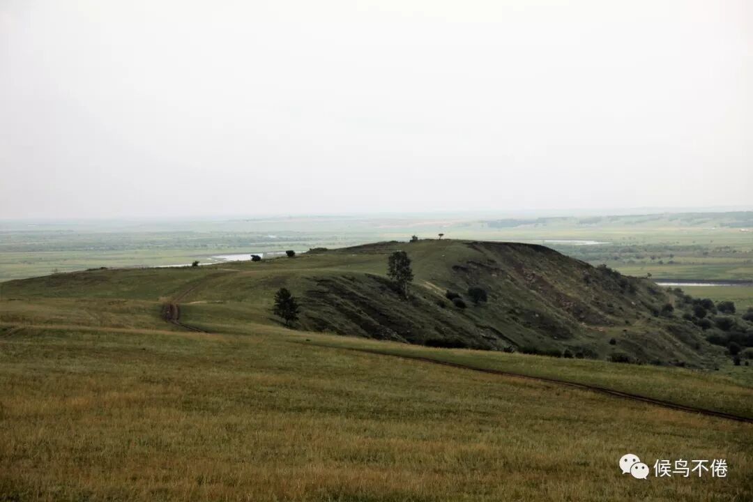 恨不能后脑勺也长了眼睛。没有太阳,我分不清方向,只能以敖包为界,正前方,左侧,大草原一望无际。到了这里,才真正懂得什么是一望无际。大概因为下雨,不见马群、牛群和羊群;右侧,远远地,起伏的山丘,被乌云染成了铅灰色,山丘和乌云几乎要亲吻在一起,再近一些,蜿蜒的伊敏河静静地穿过大草原,在我的镜头里泛着耀眼的银光,成为整个暗淡画面中唯一的亮色,衬得草原像涂了墨,这便是所谓的墨绿吧;身后,那个巨大的蒙古包(景区饭店)周围散落着数十个小的蒙古包,确切地说,是蒙古包形状的现代化旅店,可惜没有机会在这里过夜。