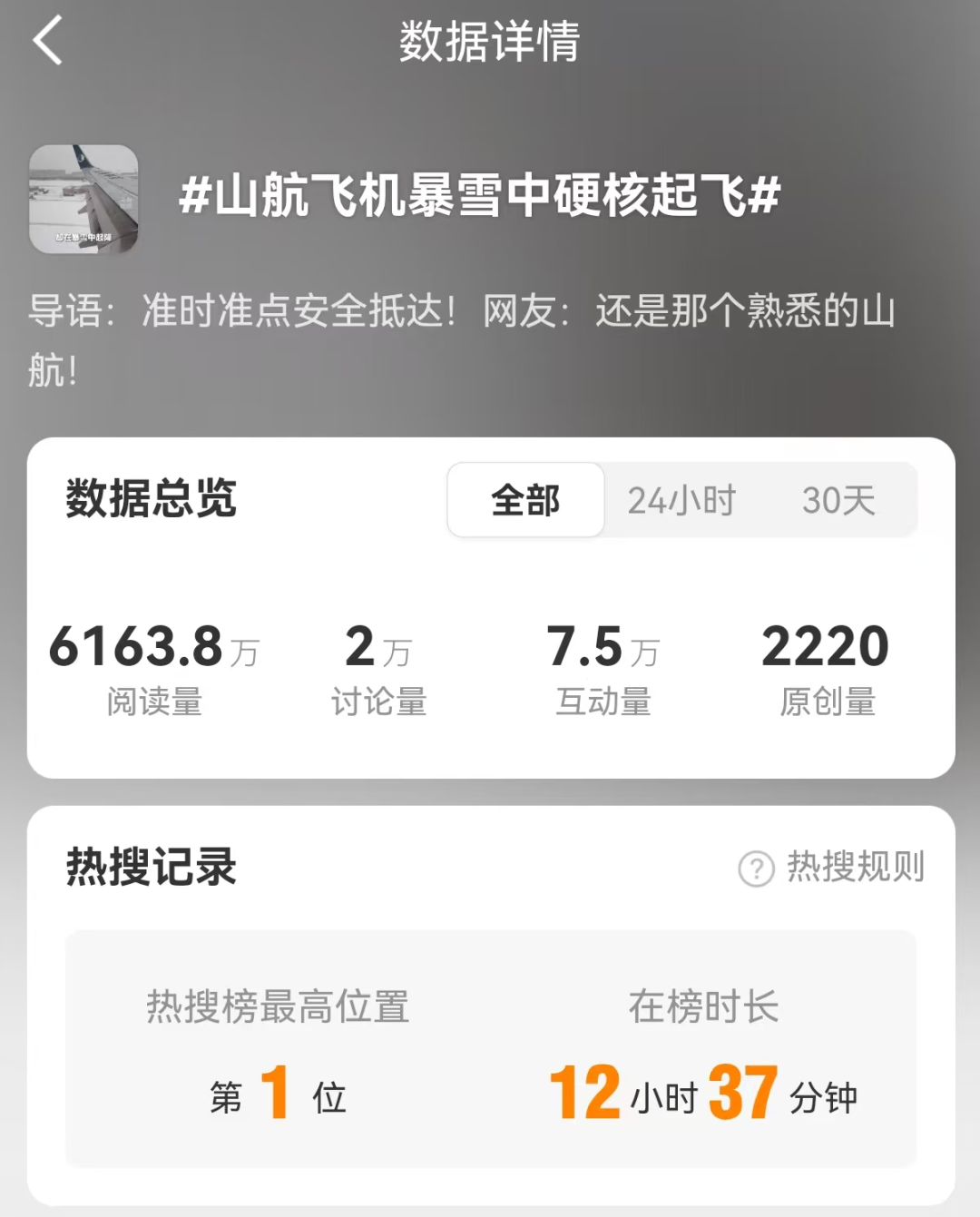 没错,山航再次“硬核起飞”,并且安全降落,相关词条也是冲上了热搜。
