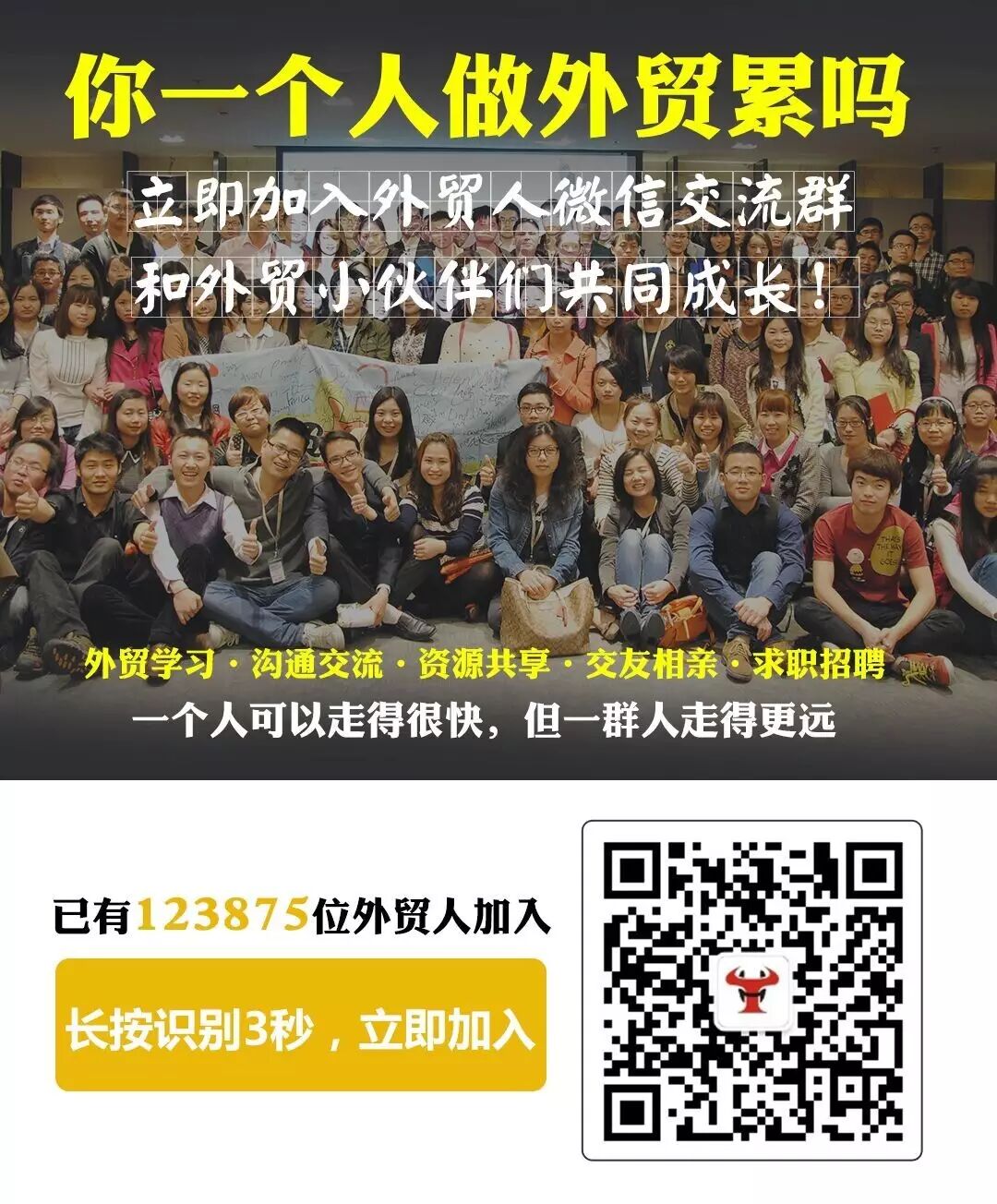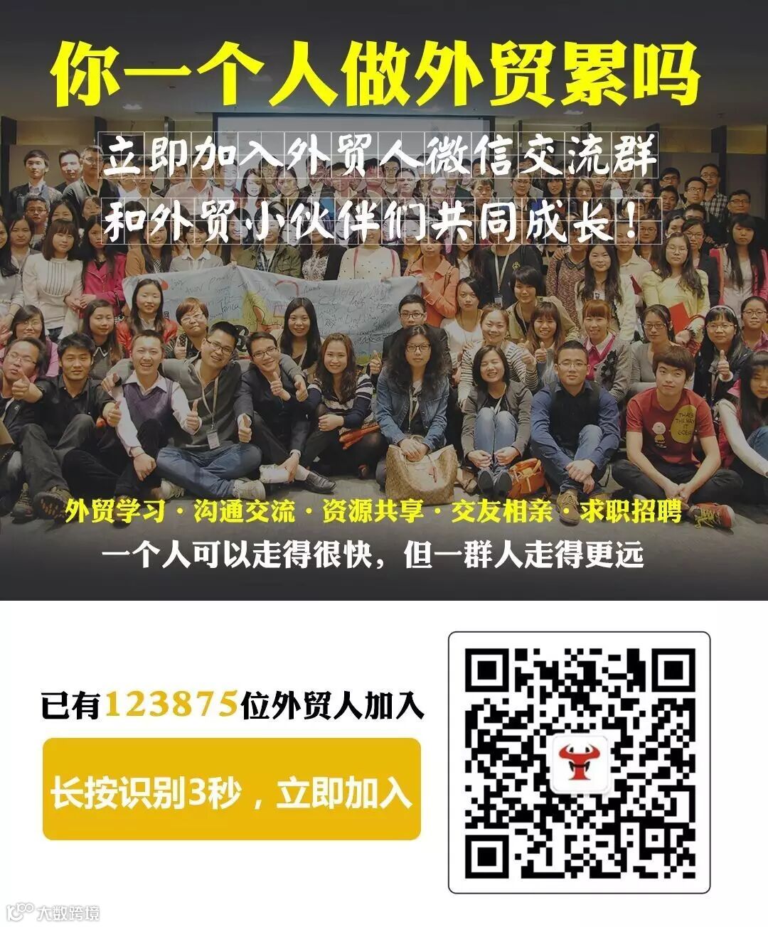 点击公众号菜单栏【我要入群】,加入外贸人微信交流群,和外贸小伙伴们共同成长!每天学习一点点,成为期待中的自己。