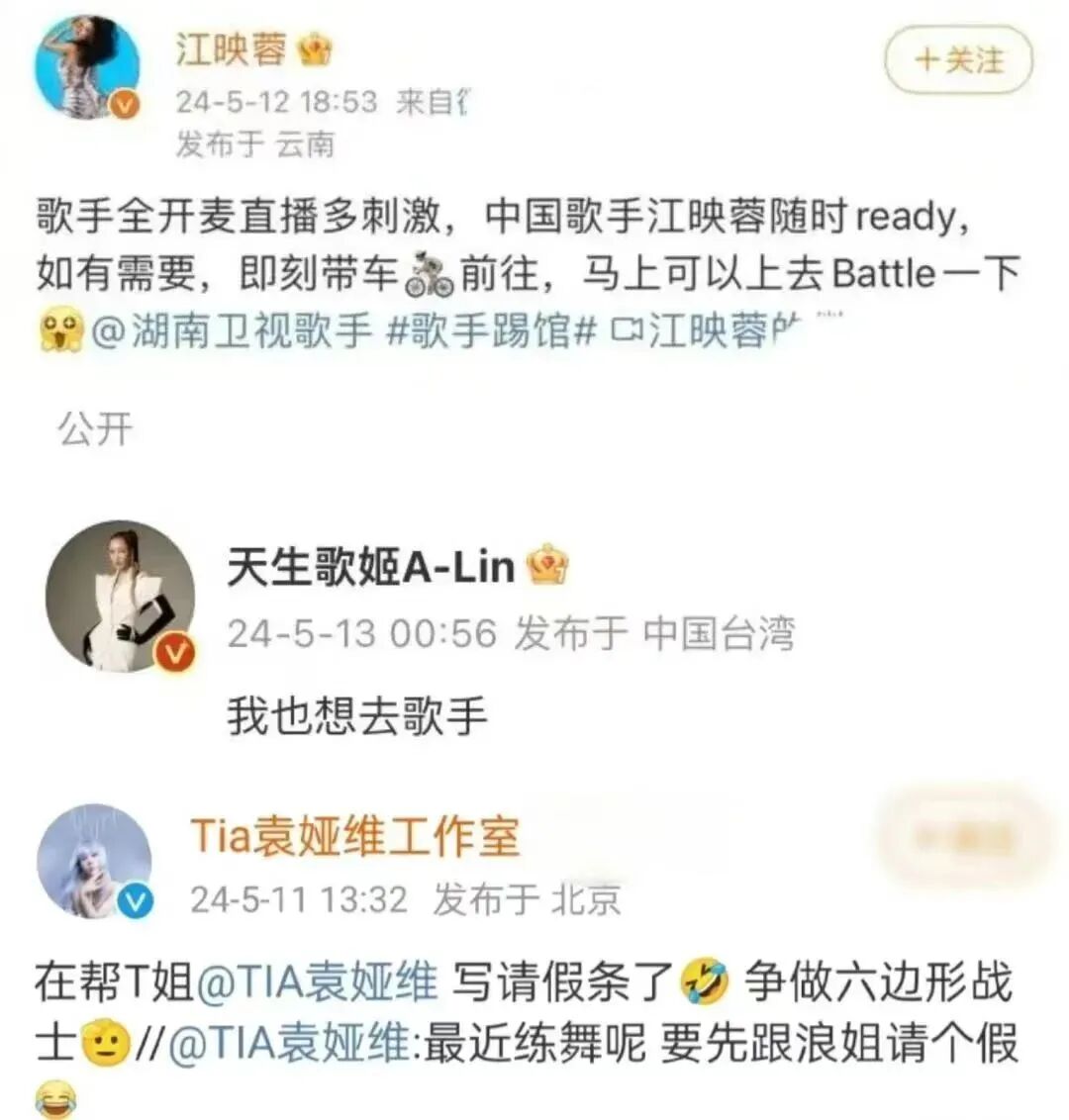 目前,微博上有网友@知名歌手求救场,也有歌手主动请战微博等社交媒体上犹如炸开了锅,#多位歌手请战歌手2024#也被盯上了热搜,俨然成了一场国民大联欢。