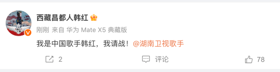 而让这次事件再度发酵的,无疑是5月12日傍晚,话题#韩红请战歌手#突然冲上热搜第一,不知道是节目组安排,还是韩红老师真的听到了呼唤,微博发声“我请战!”,将事件再次推向高潮。