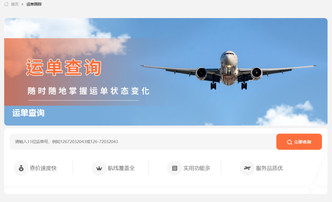 飞啊网三大核心功能之运单跟踪。查价速度快,航线覆盖全,服务品质优,只需要在飞啊网官网首页选择运单跟踪功能按钮,跳转到运单查询界面,输入11位运单号,即可查询当前运单的相关信息与实时状态,简单实用。