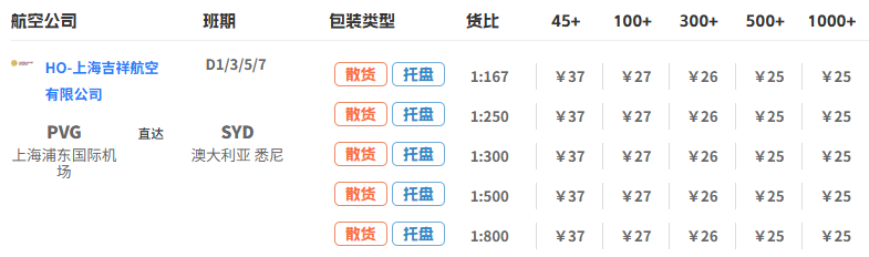 ●PVG-SYD,HO,D1/3/5/7,1天,(托盘 散货 , 1:250,45+KG→37元,100+KG→27元,300+KG→26元,500+KG→25元,1000+KG→25元)不接化工品