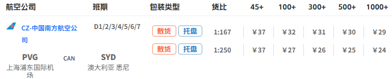 ●PVG-CAN-SYD,CZ,D1/2/3/4/5/6/7,5天,(托盘 散货 , 1:250,45+KG→37元,100+KG→27元,300+KG→26元,500+KG→25元,1000+KG→24元)二程一天俩班宽体