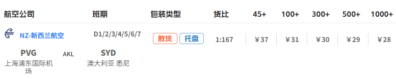 ●PVG-AKL-SYD,NZ,D1/2/3/4/5/6/7,3天,(托盘 散货 , 1:167,45+KG→37元,100+KG→31元,300+KG→30元,500+KG→29元,1000+KG→28元)