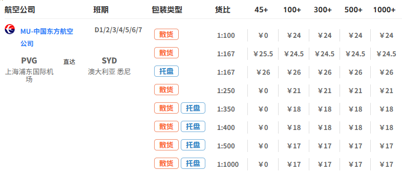 ●PVG-SYD,MU,D1/2/3/4/5/6/7,1天,(托盘 散货 , 1:1000,45+KG→0元,100+KG→17元,300+KG→17元,500+KG→17元,1000+KG→17元)