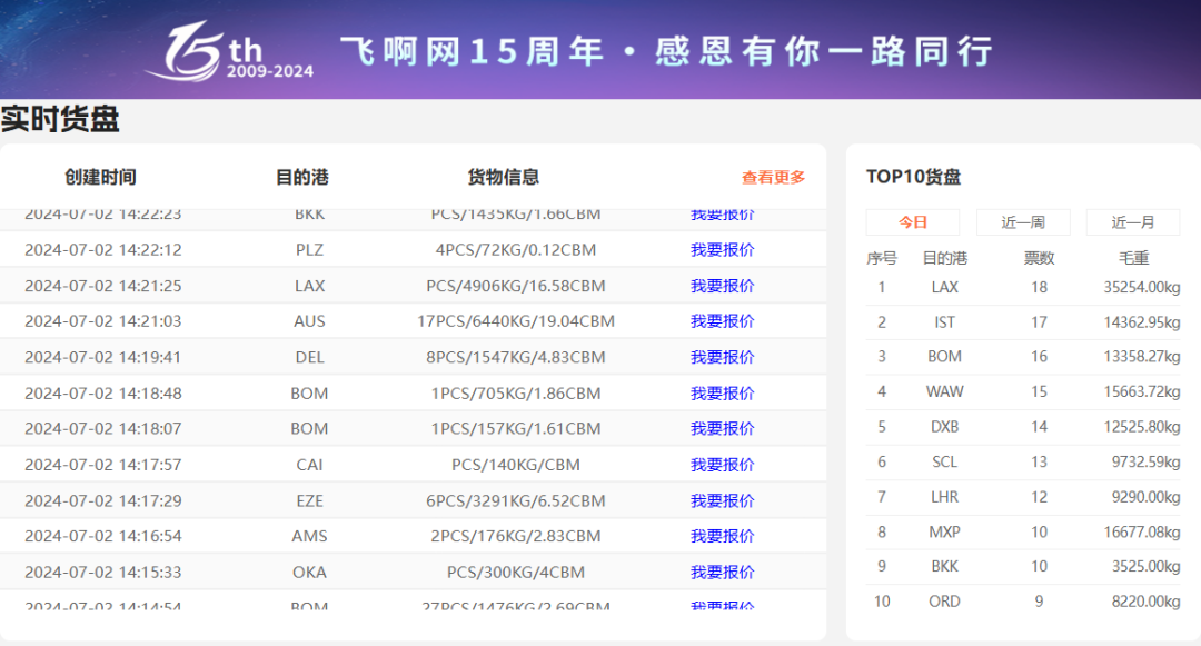 飞啊网升级上线的实时货盘板块,实时滚动播出当前货盘信息以及当日TOP10 货盘,展示货盘的目的港、件毛体等实时信息,用户可以快速查找所需货盘,点击“我要报价”按钮,即可直接进行相关报价及订舱操作,方便快捷。