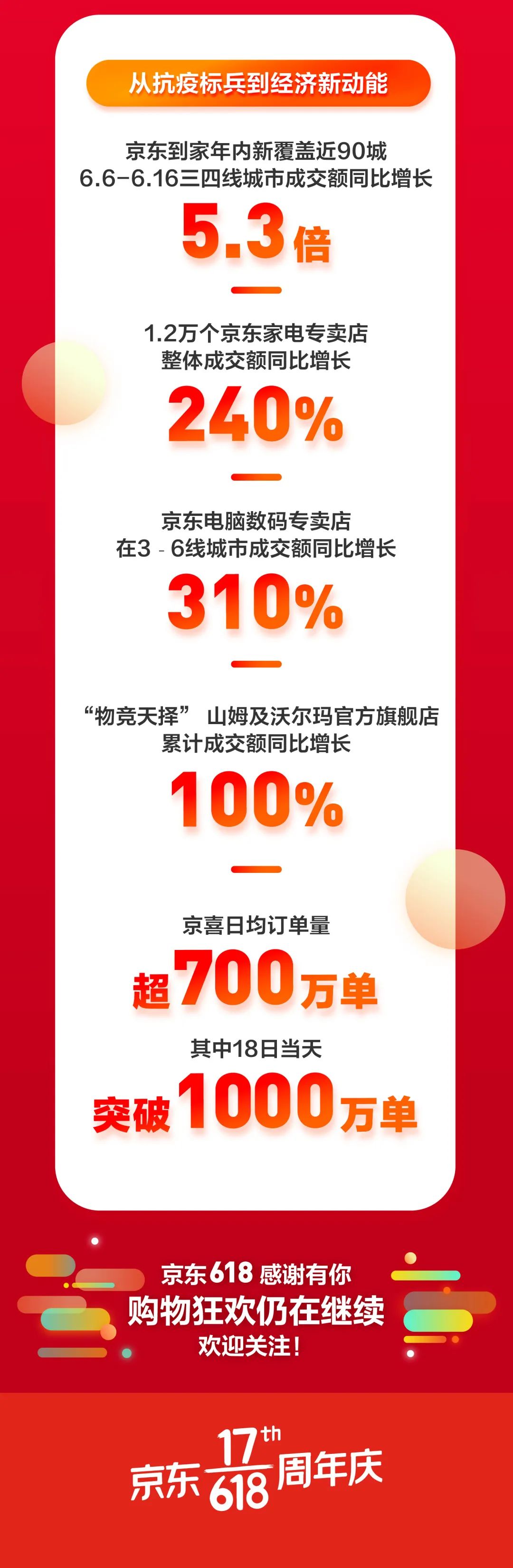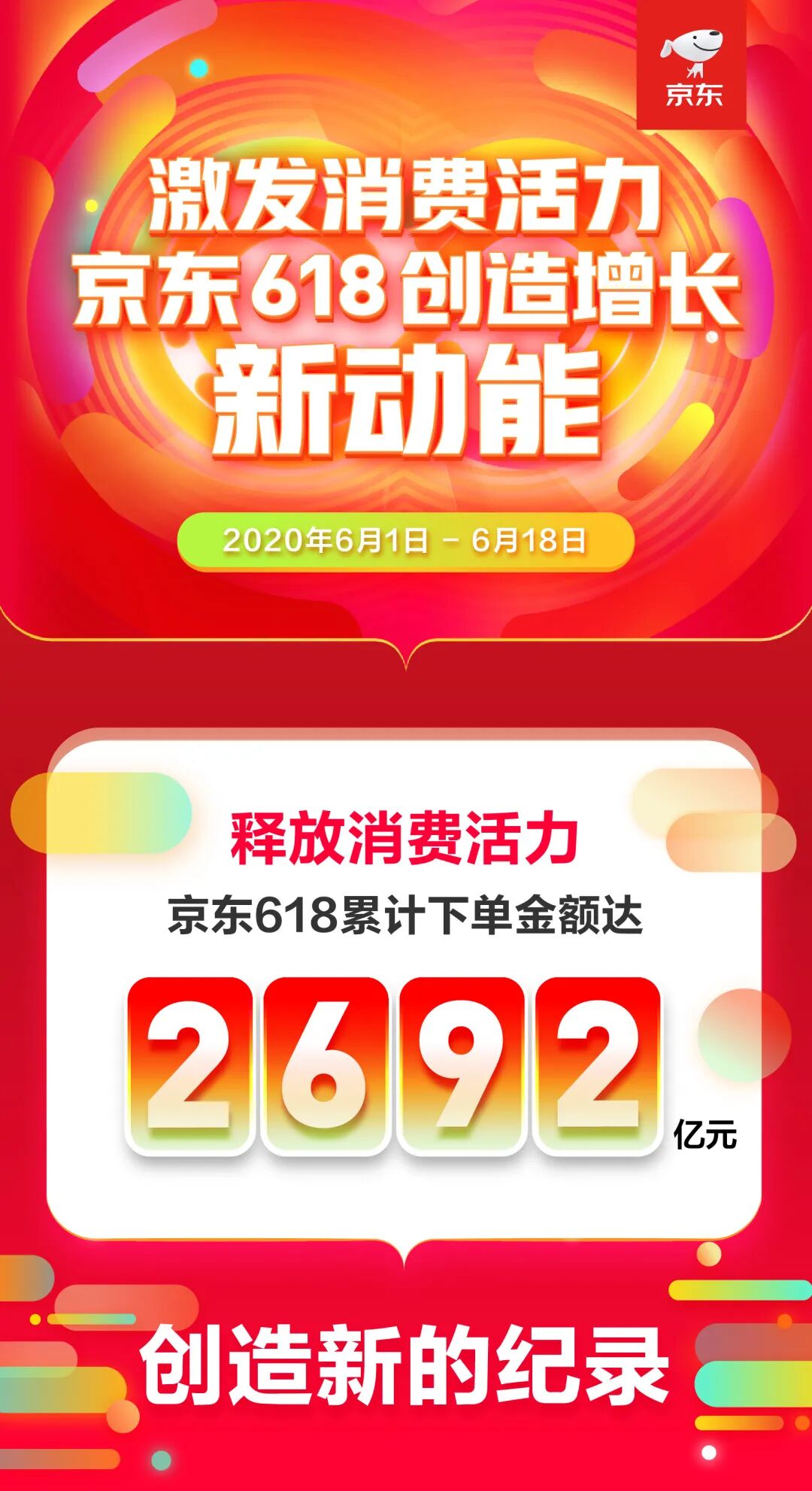 第17个京东618完美落幕,从2020年6月1日0点到6月18日24点,京东平台累计下单金额超2692亿元,创造新的纪录。