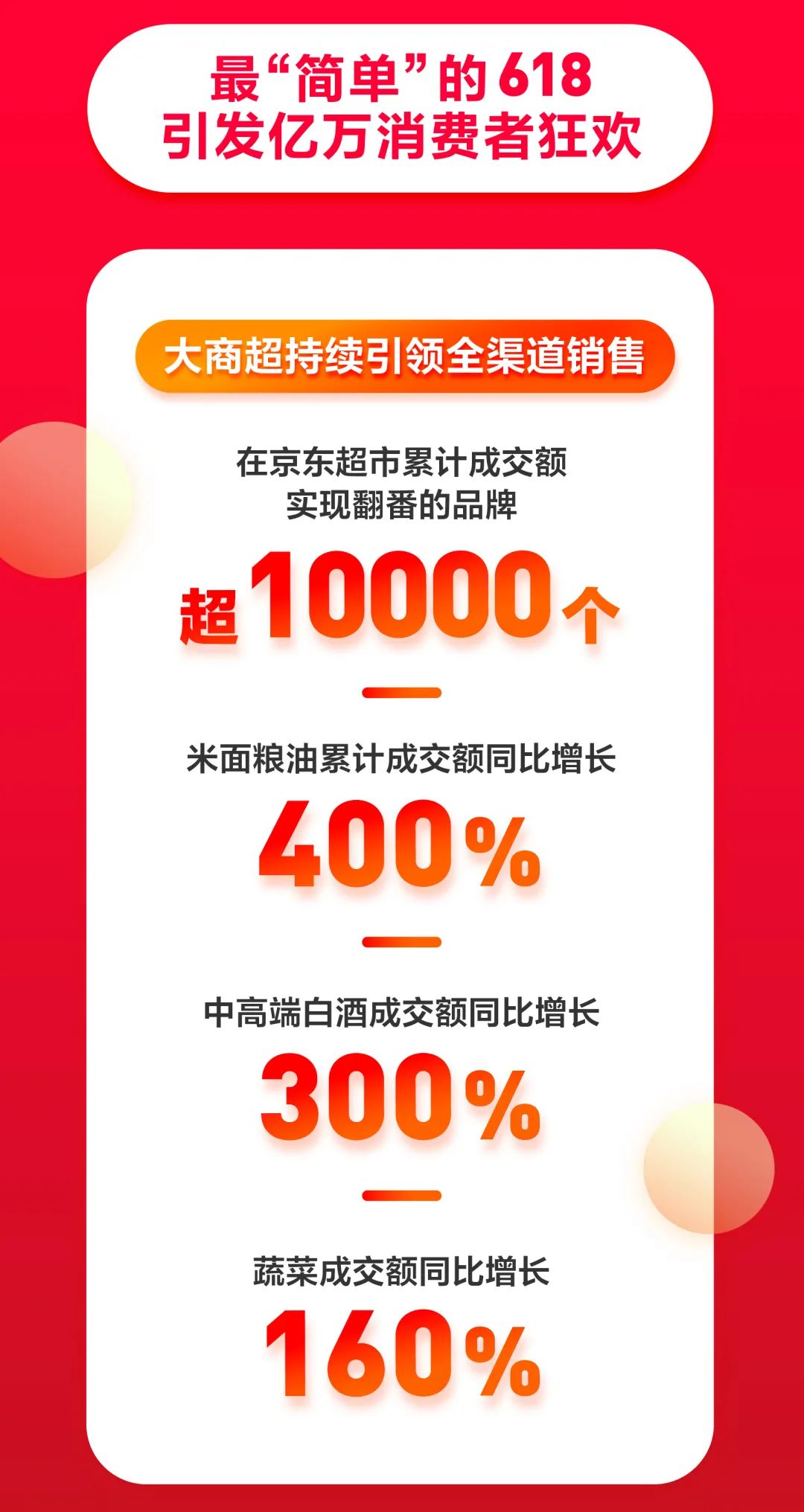 618期间,消费者的米袋子、菜篮子都装得满满当当。京东大商超米面粮油累计成交额同比增长400%,速食方便面类成交额同比增长320%,牛奶累计成交额同比增长360%。中高端白酒成交额是去年同期的4倍,宠物累计成交额同比增长110%,裤型卫生巾成交额同比增长234%,洗手液累计成交额同比增长130%。