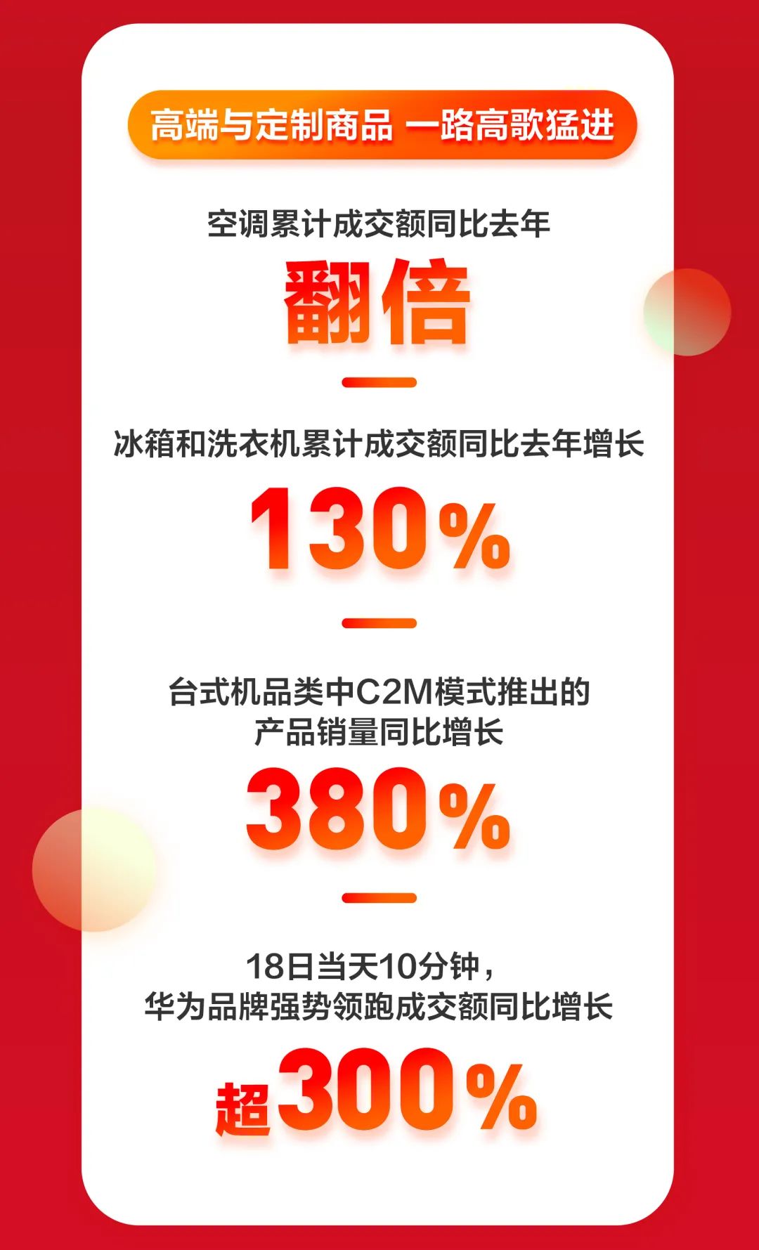 今年一季度受疫情影响较大的大家电销售正在逐步回温,618期间,京东平台空调累计成交额同比去年翻倍,冰箱和洗衣机累计成交额同比去年增长130%。家电品类升级趋势明显,618期间,健康除菌冰箱和洗衣机成交额同比去年增长500%,母婴洗衣机成交额同比增长10倍。大屏再次成为平板电视核心主流,75英寸以上超大屏电视销量同比去年增长超3倍;55英寸以上电视成交额占比电视总成交额超80%。设计新潮的戴森高端吸尘器成交额同比增长210%,2000元以上美容电器成交额同比去年增长5倍。厨卫家电品类中,高端零冷水热水器成交额在618期间同比去年超3倍。