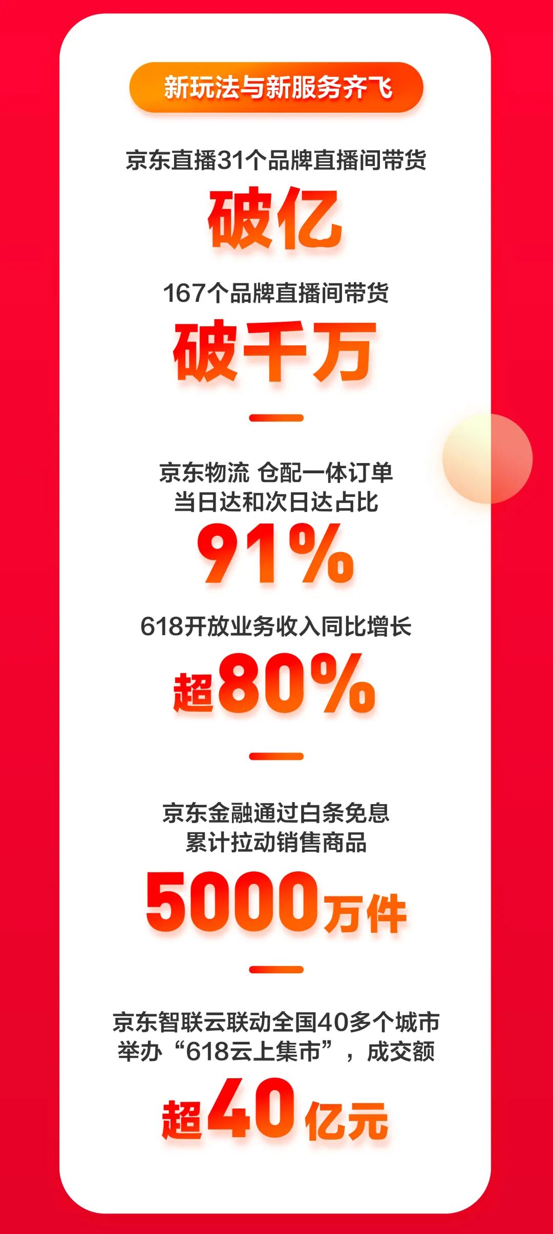 从玩法创新到服务创新,京东618惊喜不断,高潮迭起。期间,既有总价值122亿元的北京消费券强势“助攻”,还有京东零售联合快手启动的“双百亿补贴”计划,更有企业大佬、主播名嘴、明星达人轮番上阵直播带货,为消费者打造出一场场极致性价比的消费盛宴,健康类、保险类“服务型”产品层出不穷,充分激发消费热情。与此同时,京东物流发起新一轮物流大提速,“千县万镇24小时达”再次升级,京东数科旗下京东金融则将“24期免息”打造成全民购物节的新标配。