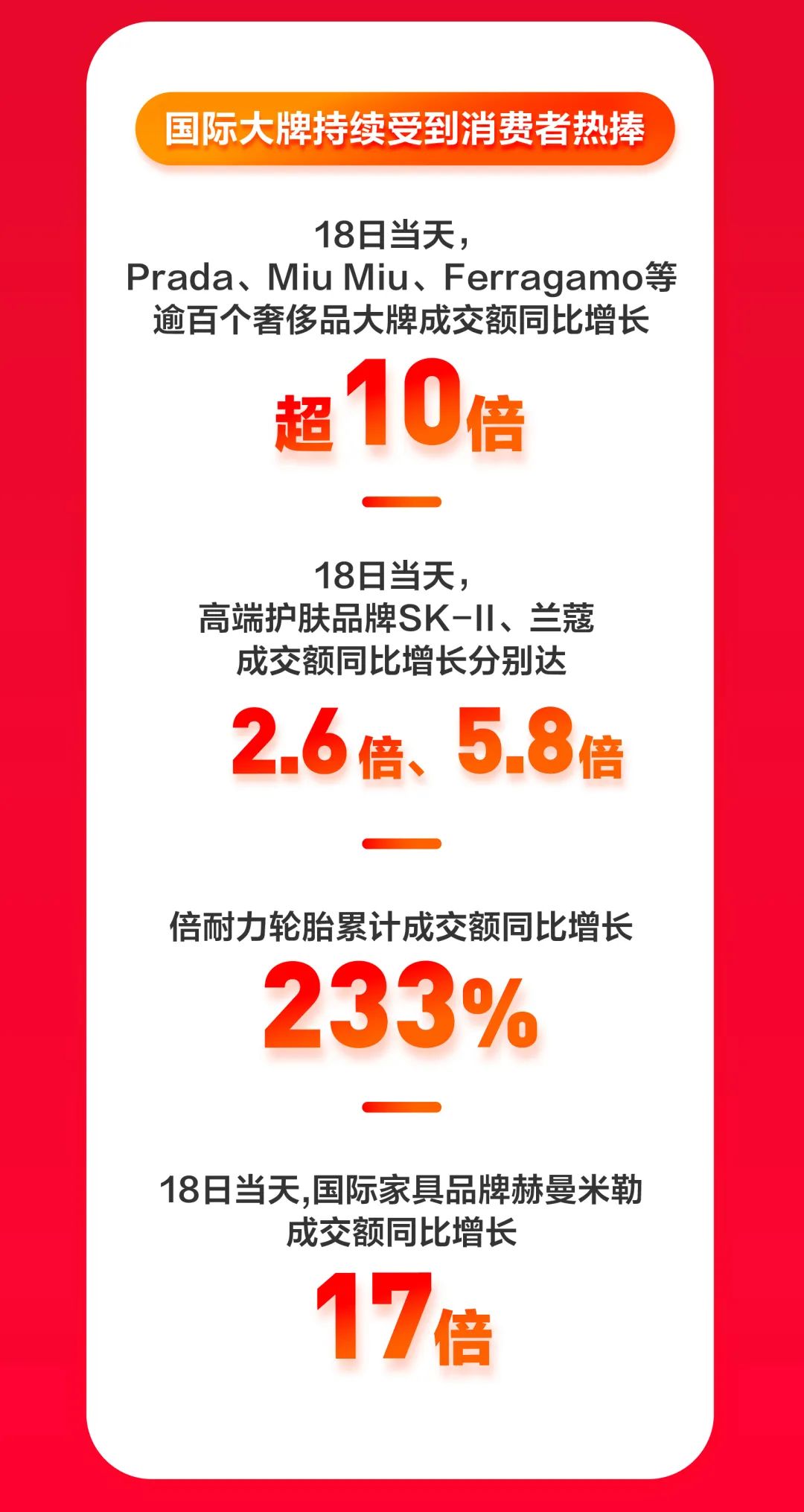 京东作为品质消费的首选平台,进口商品和国际大牌持续受到消费者热捧。6月18日,奢侈品成交额同比增长超100%,Prada、Miu Miu、Ferragamo等逾百个奢侈品品牌成交额同比增长10倍以上;高端护肤品牌SK-II、兰蔻 、雅顿、 whoo全天成交额同比增长分别达 2.6倍、5.8倍、2.9倍、2.2倍。国际品牌服饰成交额同比超过50%,Tommy、CK、Lacoste、PORTS、TUMI、雷朋、天梭、美度、汉米尔顿和雷达等品牌备受欢迎。高端瑞士手表销售火爆,萧邦成交额达去年同期10倍。618期间,国际品牌人体工学座椅成交金额同比增长5倍,6月18日,国际家具品牌赫曼米勒成交额同比增长17倍,大牌云集的运动户外品类成交额同比增长130%。当全球按下“暂停键”,拥有超大规模市场潜力的中国,成为国际品牌下一波增长的最佳沃土。