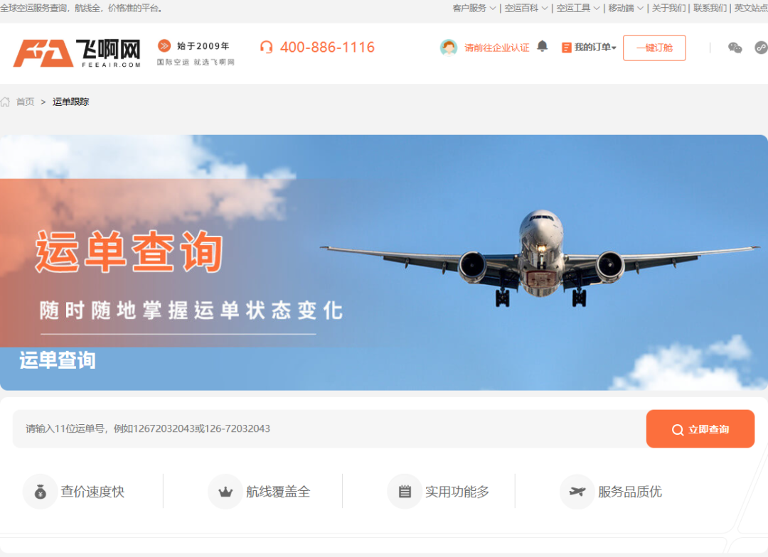 飞啊网运单跟踪功能,是平台三大核心功能之一,查价速度快,航线覆盖全,服务品质优。只需要在飞啊网官网首页选择运单跟踪功能按钮,跳转到运单查询界面,输入11位运单号,即可查询当前运单的相关信息与实时状态,简单实用。