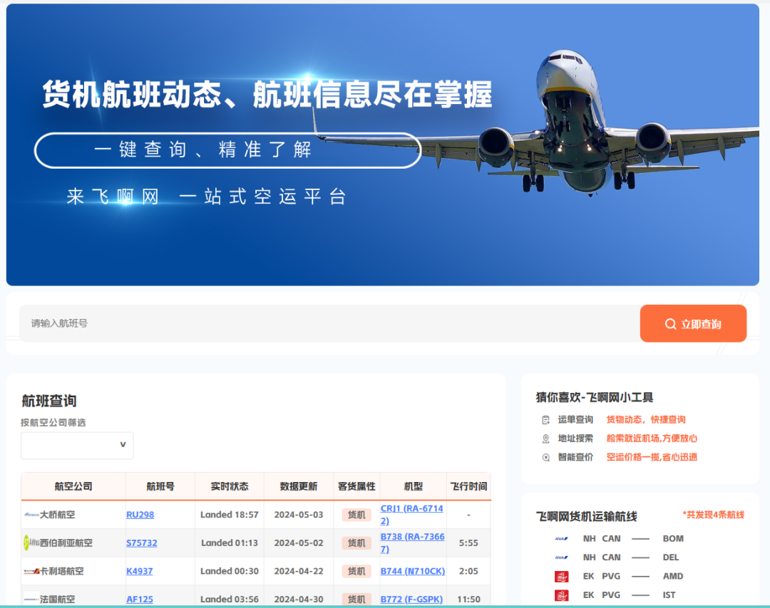 对于货代来说,航班延误可能会造成货物的准时交付,可能引发客户的不满,所以实时掌握相关航班的情况就显得尤为重要,飞啊网推荐使用运单跟踪或者航班查询功能,从而及时提醒客户,提前做好应对准备。