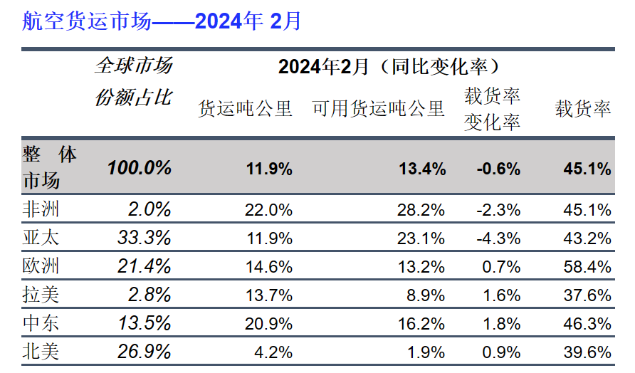 在IATA的数据中,还给出了2月份各个区域的航空货运市场表现: