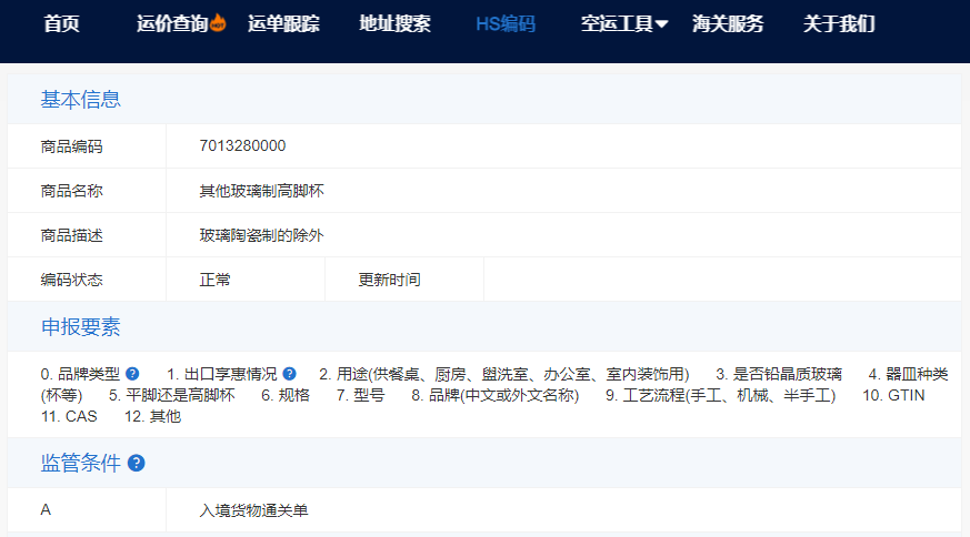用户只需要按照玻璃杯的实际特征来找对应的HS编码即可。在HS编码的详情页,可以查看商品的描述,申报要素、监管条件、检验检疫类别、税率信息、协定税率、RCEP税率、以及最新的CIQ代码(13位海关编码)。