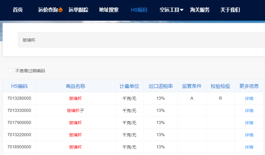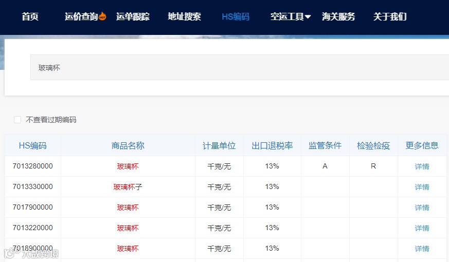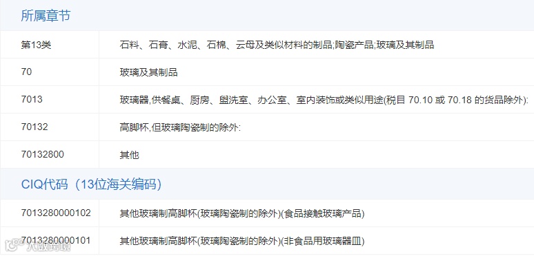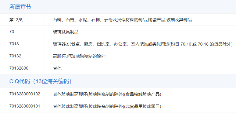 例如,输入商品名称“玻璃杯”搜索,可以找到不同的HS编码,这是因为玻璃杯会根据不同的用途、玻璃材质、器皿种类、器皿外观等条件进行归类。