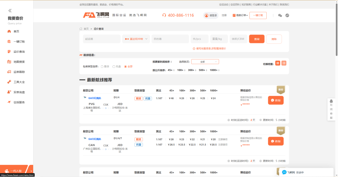 首先,飞啊网运价查询功能,帮助货代及时准确地提供最佳航线与价格信息,提升其客户的满意度、信任度,促成转化。