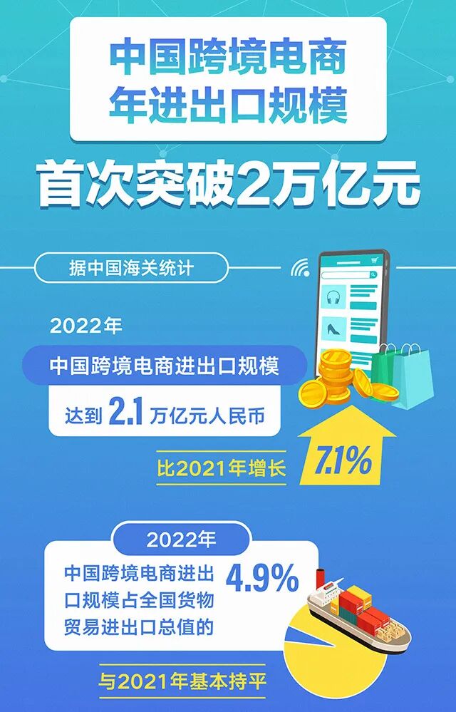 近年来,我国跨境电商市场规模持续扩大,根据新华社公布的统计数据显示,由2014年的4.2万亿元发展到2019年的10.5万亿元,年均增速逾20%。2022年,中国跨境电商进出口规模首次突破2万亿元,达到了2.1万亿元人民币,比2021年增长了7.1%。