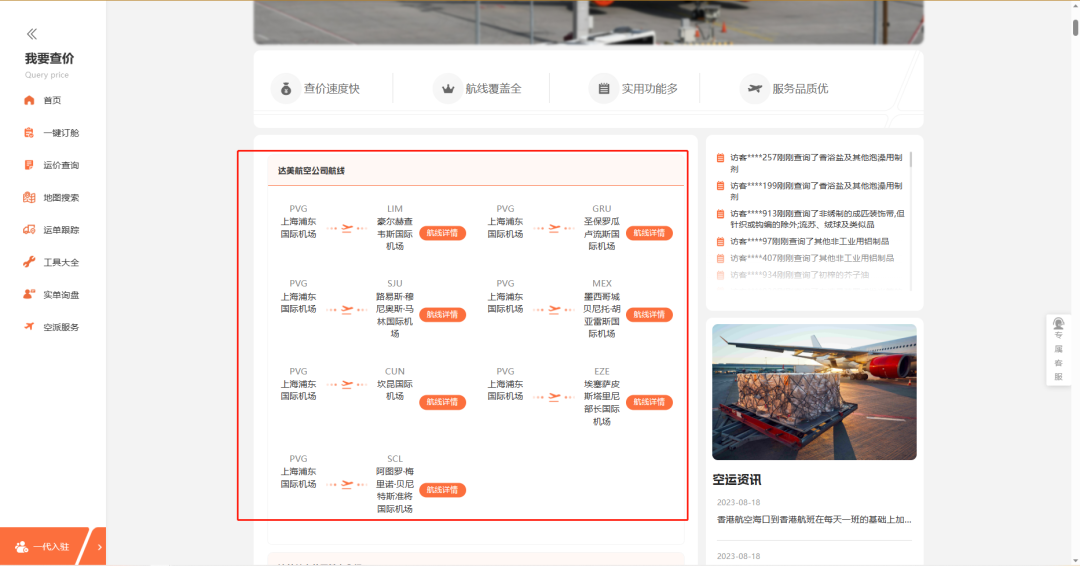 飞啊网,持续15年服务全球的一站式国际空运在线服务平台,飞啊网三大核心功能,为跨境物流提供全链条服务,帮助货代同行从询价到订舱到成单再到完成交货,在各个环节都能做到一路领先,从容不迫!