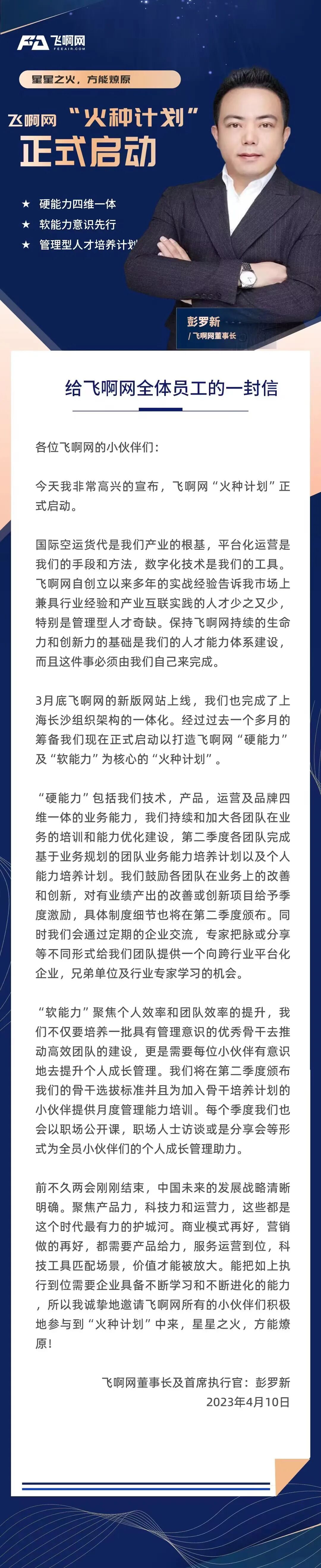 飞啊网的“火种计划”是一项任重道远的任务,每一位来到飞啊网的人才都是任务完成所需要的火种。如果想要企业具备不断学习和不断进化的能力,首先需要企业具备不断学习和不断进化的人才。