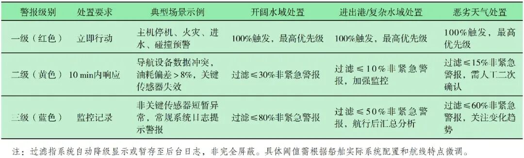 针对警报过载会削弱船员情境意识的问题,笔者利用系统既有分级功能,推行了基于航行阶段的警报分级处置策略,如表2所示。实践表明,该动态分级管理策略有效降低了警报总体频次,使驾驶员得以将更多注意力集中于高优先级警报 ( 如碰撞风险 ) 和重要航行决策。